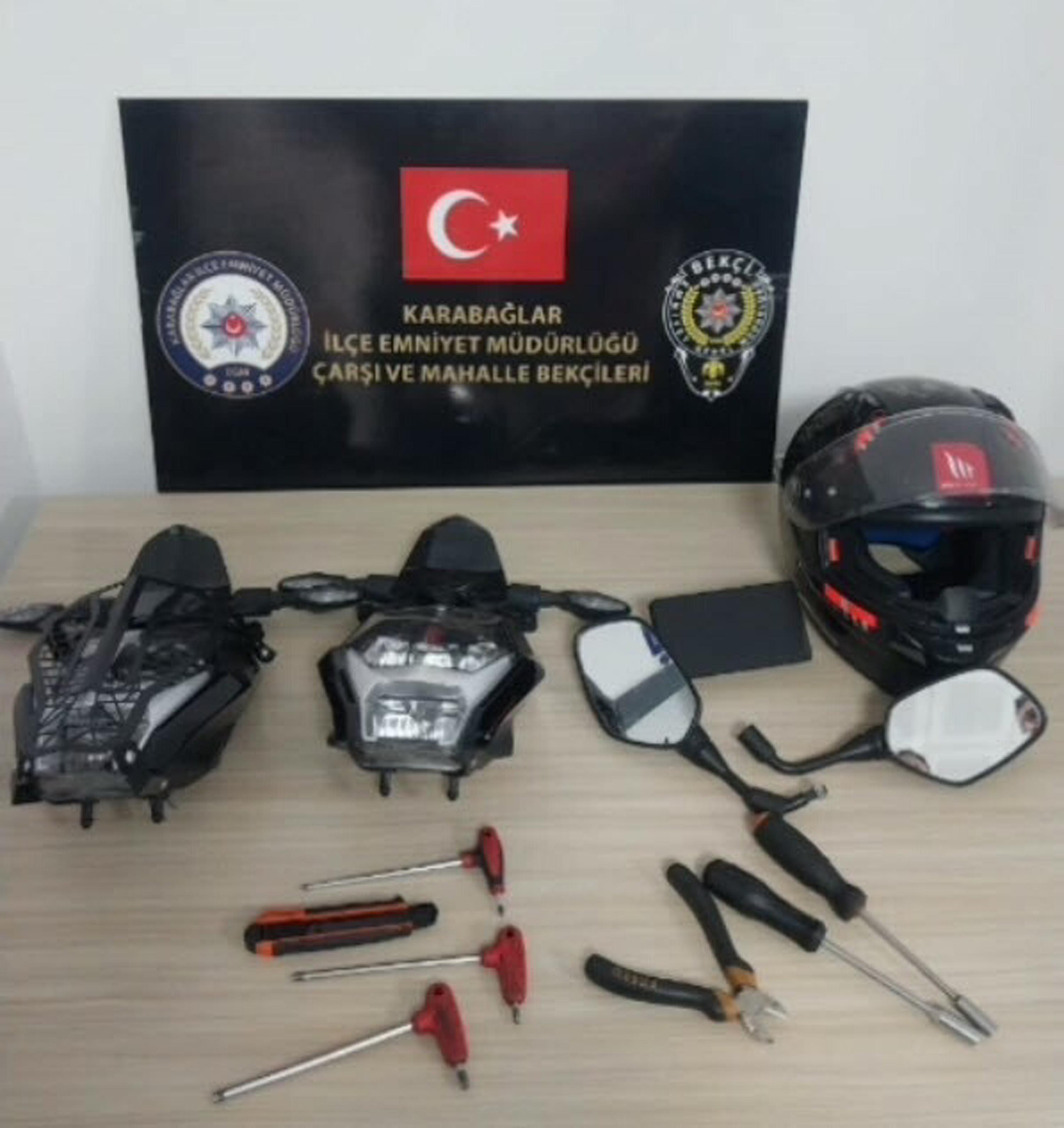 İzmir’de devriye görevinde bulunan polis ekipleri, plakasız motosikletli bir kişinin park halindeki motosikletin yanında durup, kurcalamaya başladığını fark etti. Polisleri gören şüpheli, motosikletle kaçmaya başladı. Takip sonucu yakalanan şüpheli E.B.’nin plakasız motosikletinin çantasında yapılan aramada bir başka motosiklete ait 2 motosiklet far sinyal takımı, 2 motosiklet aynası, 1 dijital ekran, 1 kask ve motosiklet parçalarının sökümü için kullanılan çeşitli aletler ele geçirildi. Çalıntı olduğu belirlenen eşyalar ile şüpheli polis merkezine götürüldü. Emniyetteki işlemlerin ardından adliyeye sevk edilen E.B., çıkarıldığı sulh ceza hakimliğince tutuklandı.