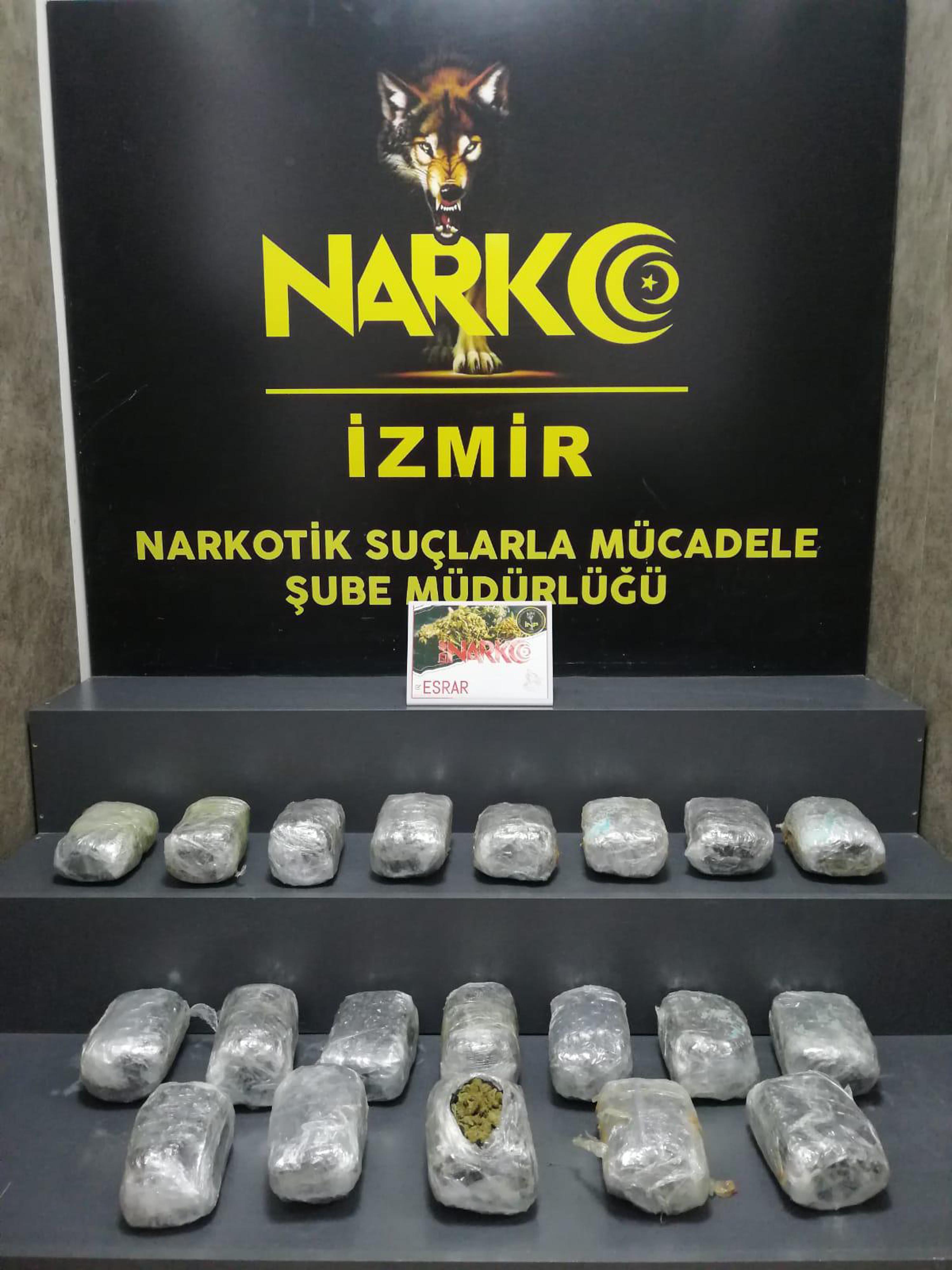 İzmir Cumhuriyet Başsavcılığı koordinesindeki İzmir İl Emniyet Müdürlüğü Narkotik Suçlarla Mücadele Şube Müdürlüğü ekipleri, bir otomobille uyuşturucu taşınacağını belirledi. Önceki gün harekete geçen ekipler, Karşıyaka ilçesinde belirlenen otomobili durdurdu. Otomobildeki aramada 11 kilo 11 gram esrar ele geçirildi. Otomobildeki M.Ş.E., M.Y., P.Y. ve Y.A. gözaltına alındı. Polisteki işlemlerin ardından adliyeye sevk edilen şüphelilerin tamamı tutuklandı.(DHA)