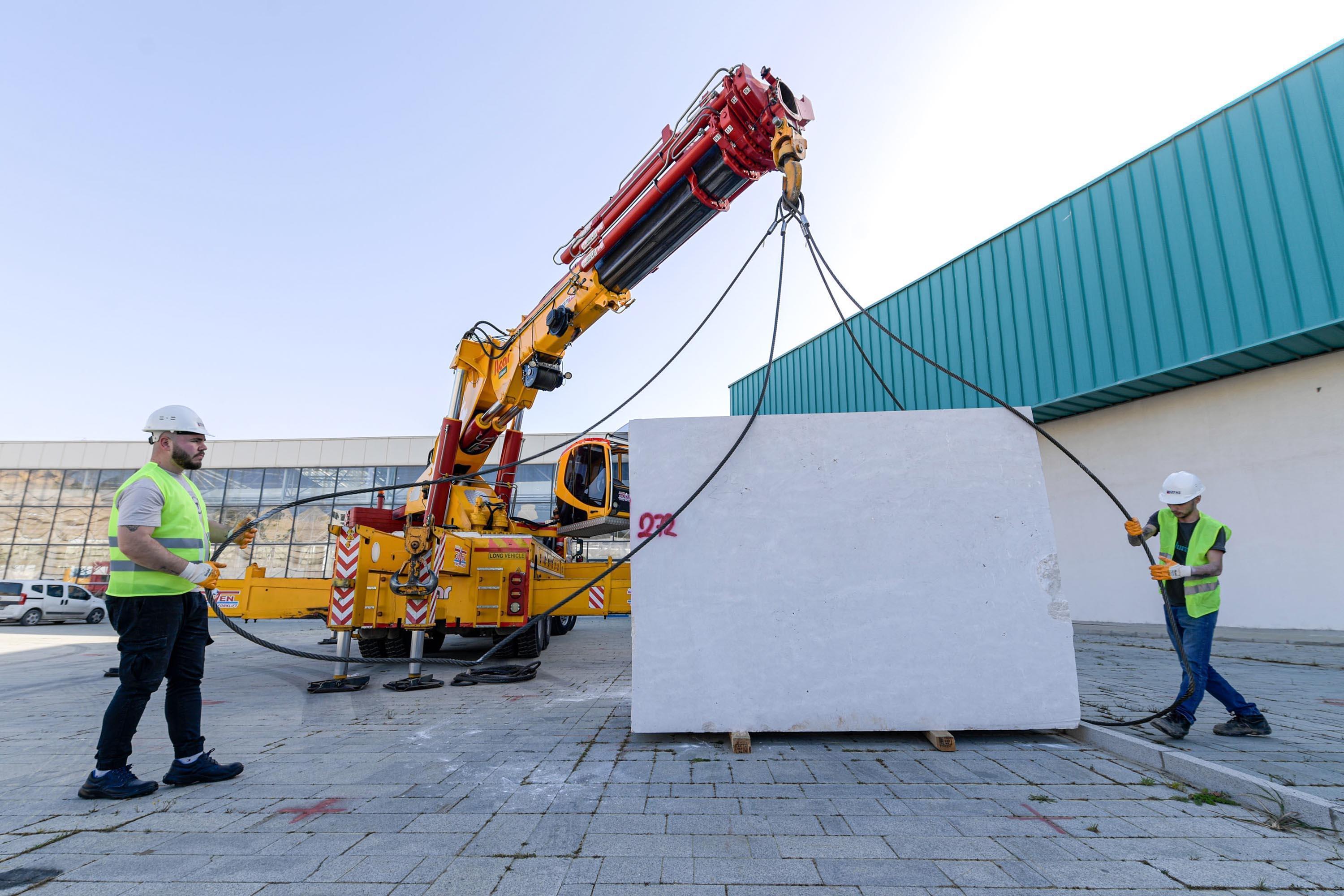 İZMİR, (DHA)-FUARİZMİR'de 17-20 Nisan 2024 tarihleri arasında düzenlenecek olan doğal taş fuarı Marble İzmir-Uluslararası Doğaltaş ve Teknolojileri Fuarı'nda kurulum hazırlıkları başladı. Sergileme alanına ilk blok taşlar getirilirken firmaların stant kurulum süreci de devam ediyor. 29. Marble İzmir için fuarizmir'e getirilen ilk doğal taş, Antalya Elmalı'daki ocaktan çıkarılan ve uluslararası piyasada Claudia Cream olarak adlandırılan bej mermer oldu.