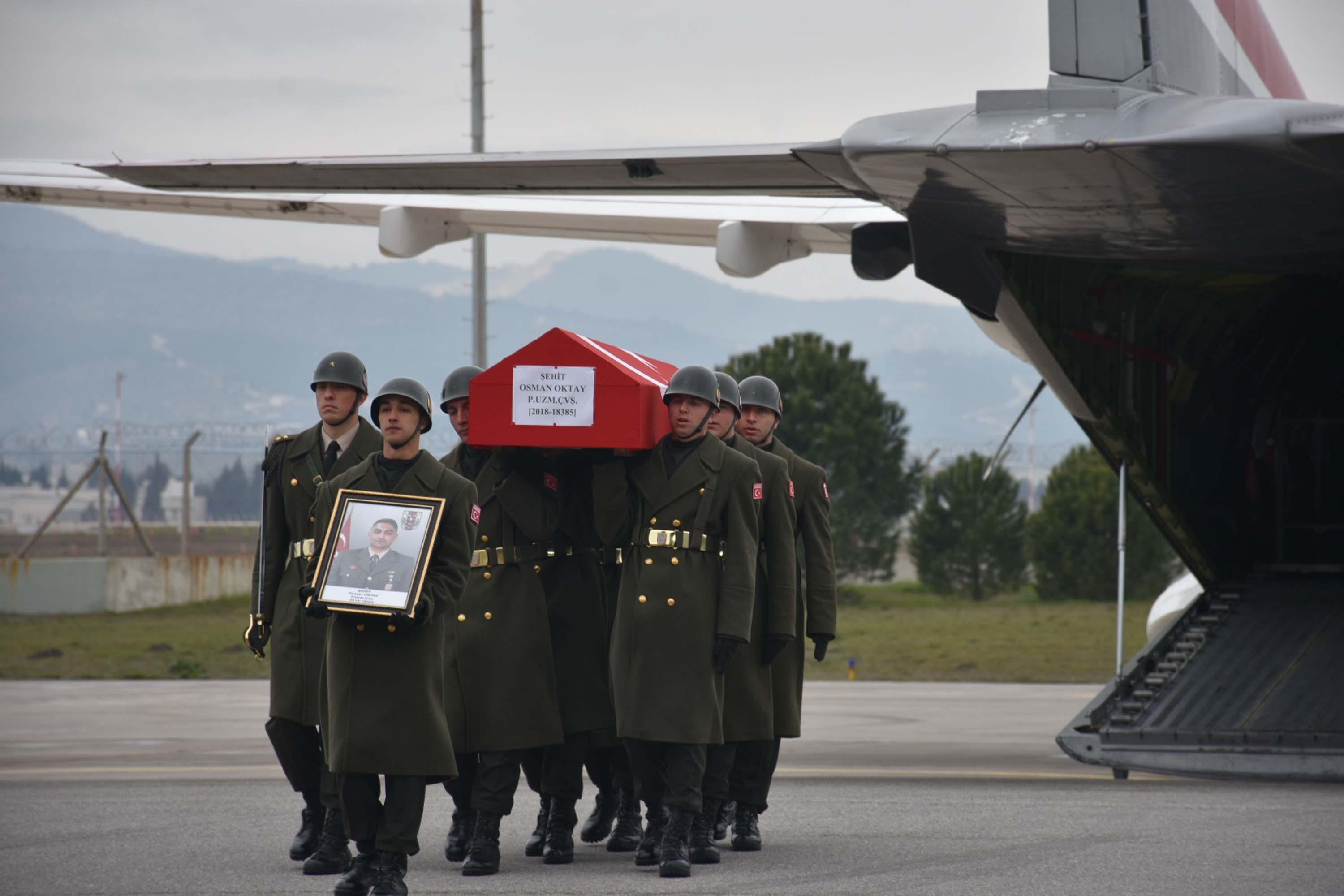Suriye'nin kuzeyinde teröristlerin taciz ateşinde yaralanıp, tedaviye alındığı hastanede 6 gün sonra şehit olan Piyade Uzman Çavuş Osman Oktay'ın (26) cenazesi, Gaziantep'te düzenlenen törenin ardından askeri uçakla İzmir'e getirildi. Şehit Oktay için Adnan Menderes Havalimanı'ndaki askeri bölgedeki apronda karşılama töreni düzenlendi. Törene, askeri ve sivil yetkililer ile Oktay'ın annesi Hori Oktay ile kardeşleri katıldı. Oktay'ın cenazesi, askeri uçaktan tören kıtası tarafından aprona indirildi. Ardından tören kıtası tarafından şehidin Türk bayrağına sarılı naaşı, cenaze aracına taşındı. Şehit Oktay'ın ailesi gözyaşlarına hakim olamadı. (DHA)