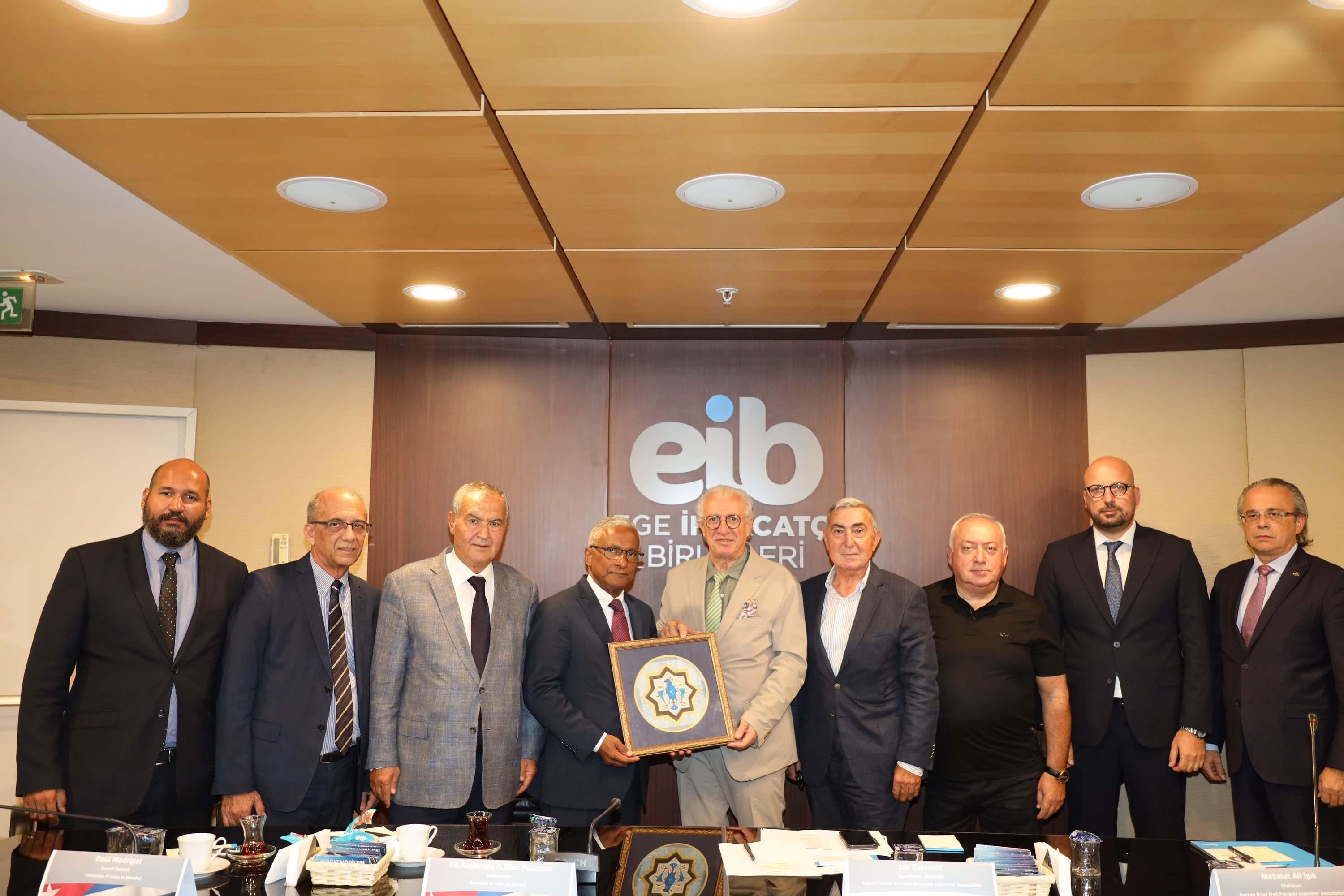 İZMİR, (DHA)-İZMİR Enternasyonal Fuarı'nın (İEF) özel konuğu olan Küba'nın Ankara Büyükelçisi Dr. Alejandro F. Diaz Palacios, beraberindeki heyet ve 15 firma temsilcisiyle Ege İhracatçı Birlikleri'ni (EİB) ziyaret etti. Türk ürünlerini İspanyol ve İtalyan distribütörler aracılığıyla ithal ettiklerini, Türkiye'ye ihracatlarını da İspanyol ve İtalyan firmalar aracılığıyla yaptıklarını dile getiren Büyükelçi Dr. Alejandro F. Diaz Palacios, İzmir'de ihracatçı firmalarla direkt temas kurmak istediklerini, Türkiye ile dış ticareti geliştirmek istediklerini söyledi.