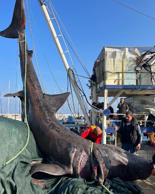 Kadir ÖZEN/İZMİR, (DHA)- İZMİR'in Urla ilçesinde tekneyle ava çıkan balıkçılar, 10 metre boyunda, 2 ton ağırlığında camgöz cinsi köpek balığı yakaladı. Köpek balığı sahile vinçle getirildi.