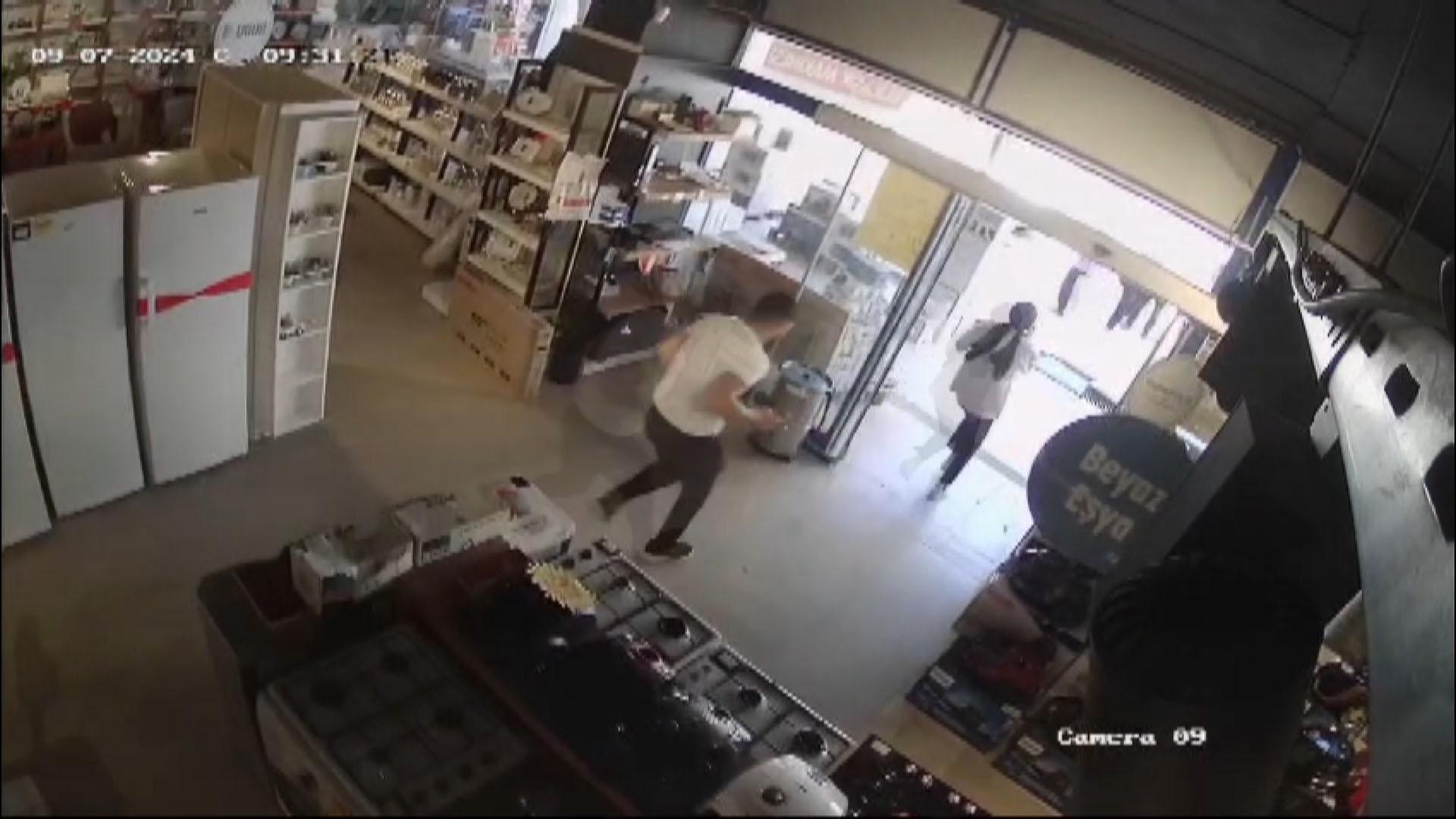 Merkez üssü Kahramanmaraş'ın Pazarcık ilçesi olan 5 büyüklüğündeki deprem anı, bir iş yerinin güvenlik kamerasına yansıdı. Görüntülerde, depremin şiddetiyle eşyaların sallanması ve o sırada iş yerinde bulunanların panikle dışarı çıkması yer aldı. (DHA)