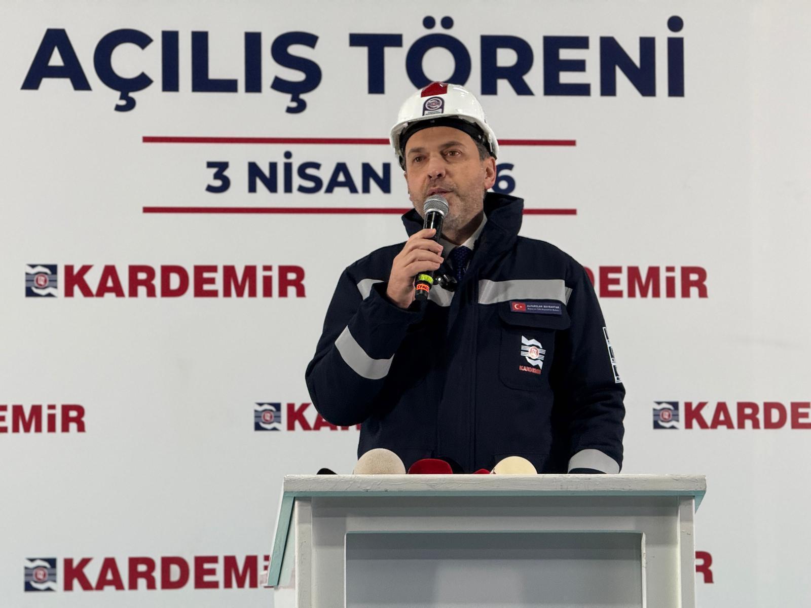 Parti ziyaretinin ardından KARDEMİR tesisine gelen Bakan Bayraktar, 2 Nolu Sürekli Döküm Makinası açılış törenine katıldı. KARDEMİR’in ülke sanayisi için 89 yıldır çok önemli bir görevi yerine getirdiğini anlatan Bakan Bayraktar, “İçerisinde yaşadığımız günler, içerisinde olduğumuz kriz dönemleri bize şunu söylüyor; 'Türkiye çok güçlü olmak zorunda. Türkiye çok güçlü bir sanayiye, imalat sektöründe kendi kendine yeten milli ağır sanayiye sahip olmak zorunda.' KARDEMİR hakikaten büyük bir marka. Dünya çapında olabilecek bir marka. Ama ülkemizin sanayi yolculuğunda müstesna bir yeri var. Onun için biz hep şunu söyledik, Karabük'te bunu söyledik, Türkiye'de bunu söyledik; 'Adeta gözbebeğimiz gibi olan Kardemir'e böyle davranmamız, böyle bakmamız lazım.' Biz de devlet olarak böyle baktık, böyle bakıyoruz. Türkiye Varlık Fonu'nun ortak olduğu ender şirketlerden birisi burası. Dolayısıyla artık devlet olarak her daim gözümüzün olduğu, takip ettiğimiz önemli bir şirketimiz. Kardemir'in geleceği inşallah sizlerle beraber çok daha parlak olacak." şeklinde konuştu.