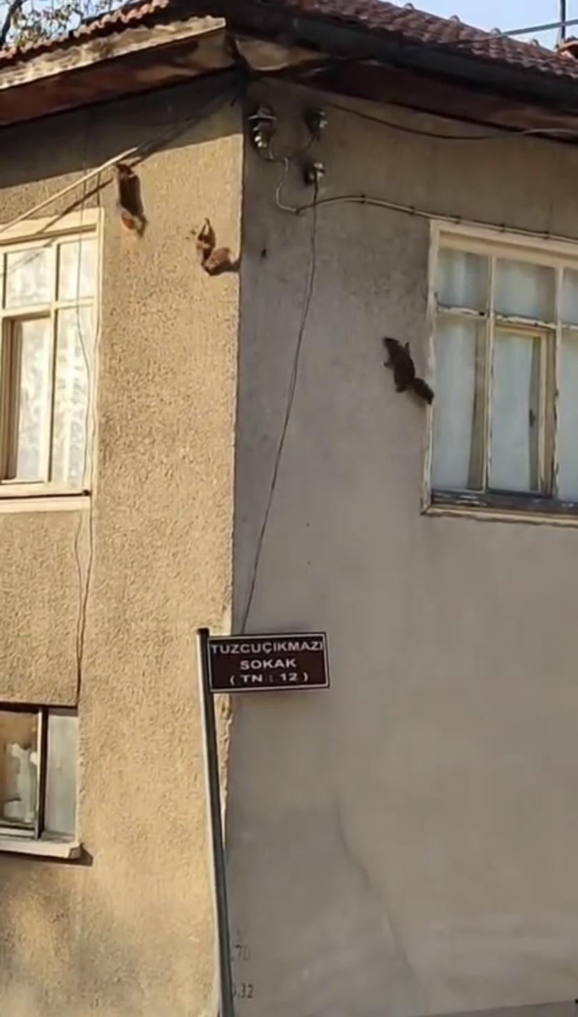 Safranbolu ilçesine bağlı Bağlarbaşı Mahallesi Tuzcuçıkmazı Sokak’taki 2 katlı bir evin duvarında gezinen 3 sincabı gören kişi, cep telefonuyla kayda girdi. Görüntülerde sincapların rahatlıkla duvarda gezindiği görüldü. Sincaplar bir süre sonra gözden kayboldu. (DHA)
