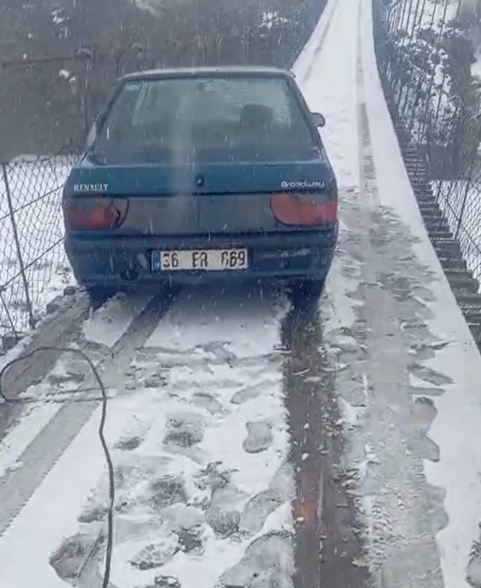 Olay, Küçükaküzüm köyü ile Yılanlı köyünü birbirine bağlayan asma köprüde meydana geldi. Yağan kar ve soğuk hava nedeniyle buz tutan asma köprüde ilerleyen İzzet Koçak'ın kullandığı otomobil kaydı. Buzla kaplı zeminde ilerleyen otomobil, köprünün ortasında durdu. Ön lastiği köprüden çıkan otomobili kurtarmak için köylüler devreye girdi. Küçükaküzüm köyü muhtarı Teoman Gelekçi ve köylüler, asma köprüde kalan otomobili traktöre bağladıkları halatla çekerek kurtardı. O anlar, cep telefonuyla kaydedildi. (DHA)