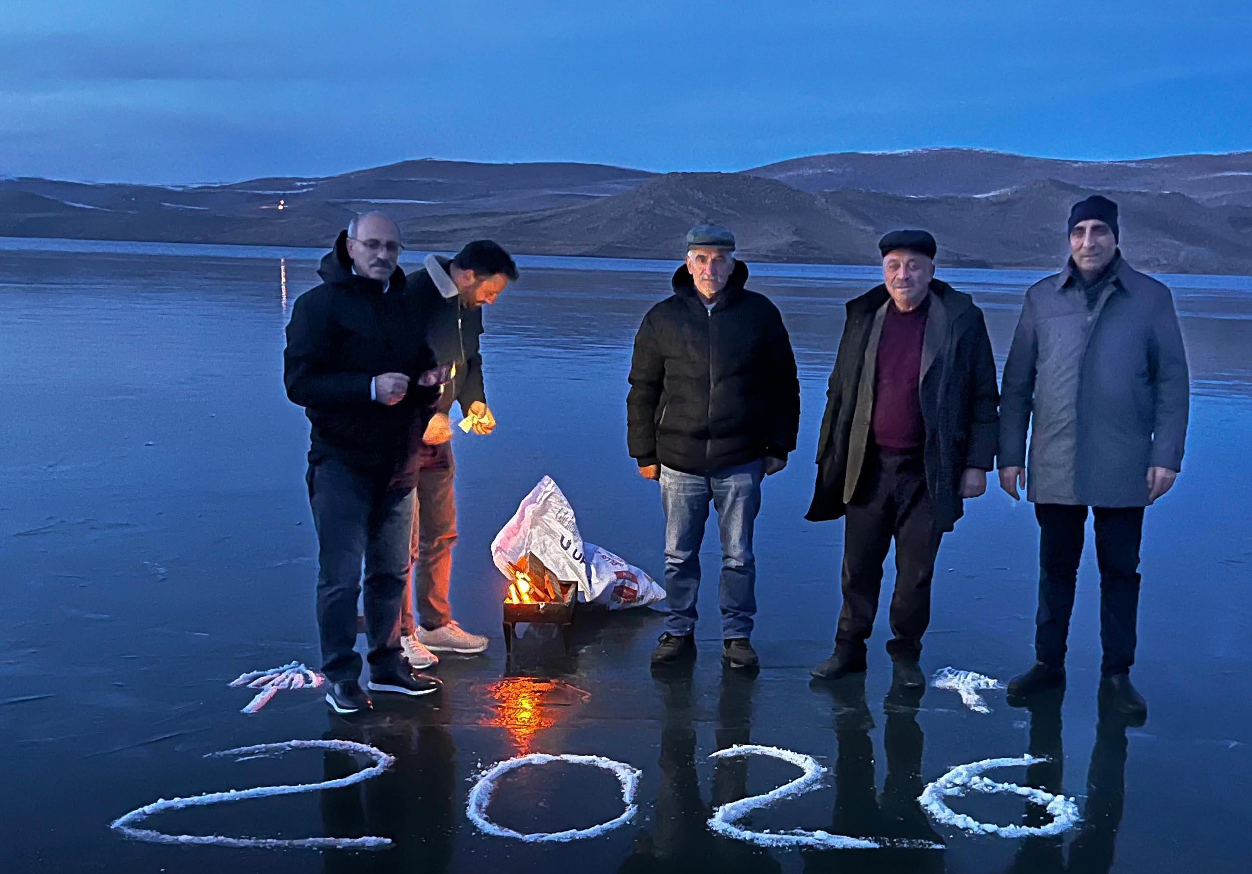 Yeni yılı yüzeyi buz tutan Çıldır Gölü’nde kaz eti yiyerek karşıladılar
