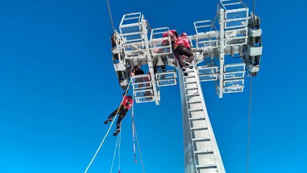 Sarıkamış ilçesinde 2 bin 200 rakımlı Cıbıltepe Kayak Merkezi’nde, teleferik hatlarında arıza durumunda mahsur kalanların kurtarılması amacıyla yapılan tatbikatta, telesiyejde kurtarılmayı bekleyenler için JAK ekipleri harekete geçti. Kış sezonu önceki JAK timleri, telesiyej tellerine tırmanarak, halatla mahsur kalan 3 kişiye ulaştı. Görevliler tarafından mahsur kaldıkları yerden alınanlar, halatlarla indirildi. (DHA)