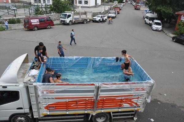 Kars’ta hava sıcaklığı 35 dereceye ulaşınca, bunalan vatandaşlar farklı yöntemler deniyor. Cam film ustası, 3 çocuk babası Alican Kaya Poyraz (42) da kamyonunun dorsesini su doldurarak havuz gibi kullanmaya başladı. İş yerinde sıcaktan bulanan Poyraz, çırakları, yeğenleri ve komşu çocukları ile mola verdiklerinde, havuza girerek serinliyor. Göletlere girişin yasak olması nedeniyle kendilerince böyle bir yöntem bulduklarını söyleyen Alican Kaya Poyraz, “42 yaşındayım ilk defa böyle bir sıcak hava gördüm. Kendi imkanlarımızla kamyonumuzun dorsesine su doldurduk, bu şekilde serinlemeye çalışıyoruz. Kendimize göre bir havuz yaptık. İş olmadığı zaman serinlemek istediğimiz zaman havuza giriyoruz, çıraklar, yeğenler ve çocuklarla yüzüyoruz. Bu havuz çocuklara bir nevi macera oldu. Göletlere giriş yasak olduğu için gidemiyoruz mecbur serinlemek için böyle bir çare bulduk" diye konuştu.