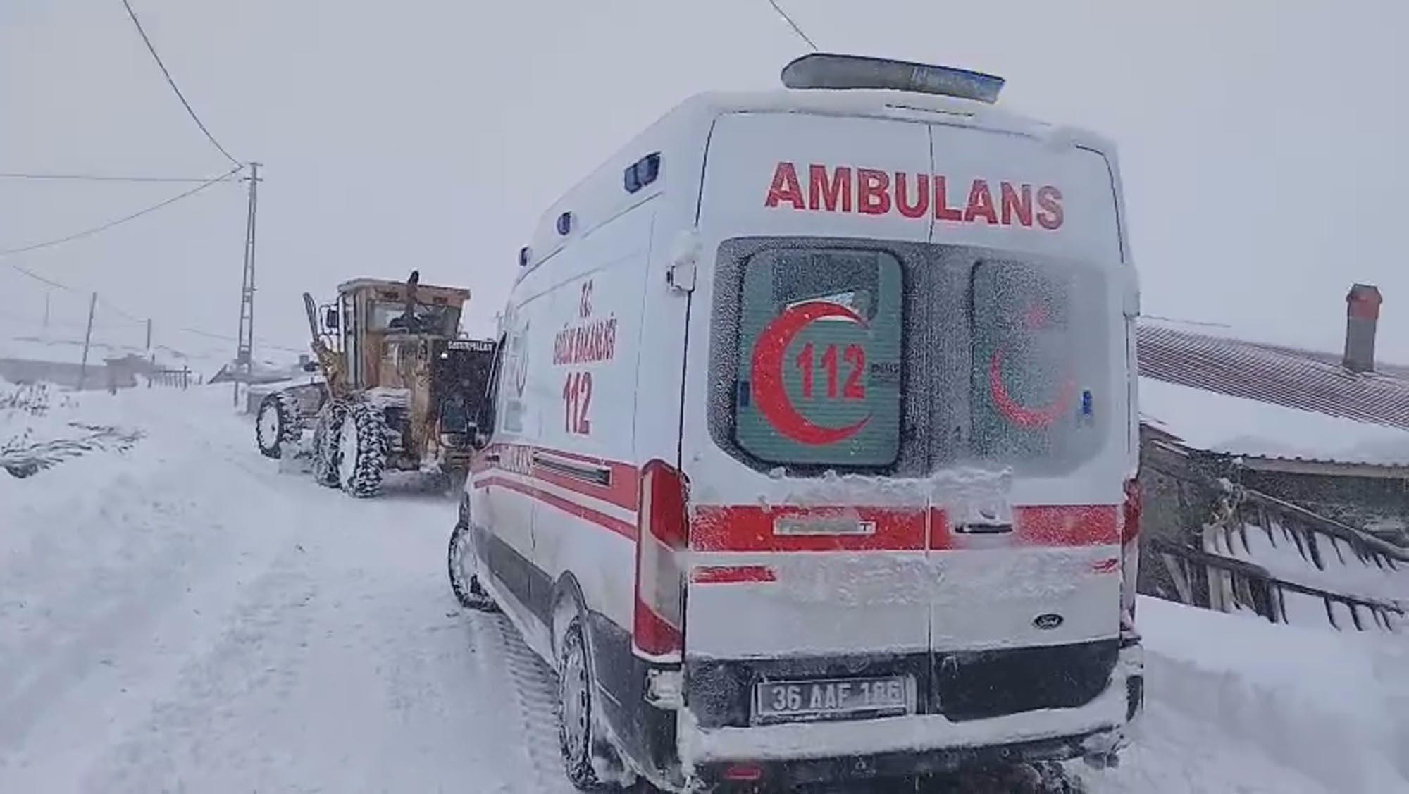 Digor ilçesi Türkmeşen köyünde yaşayan Aydın Abay rahatsızlanınca yakınları durumu 112 Acil Çağrı Merkezi'ne bildirdi. İhbar üzerine köye hareket eden sağlık ekiplerinin bulunduğu ambulans, yoğun tipi nedeniyle görüş mesafesinin yaklaşık 10 metreye düştüğü bölgede kara saplandı. Bunun üzerine bölgeye İl Özel İdaresi ekipleri sevk edildi. İş makineleriyle yürütülen hummalı çalışma sonucu ambulans saplandığı yerden çıkarıldı. Özel İdare ekiplerinin şantiye aracıyla evinden alınan Abay, ambulansa nakledildi. Ambulans, iş makinelerinin kontrolü altında hastayı Digor Devlet Hastanesi’ne götürdü.