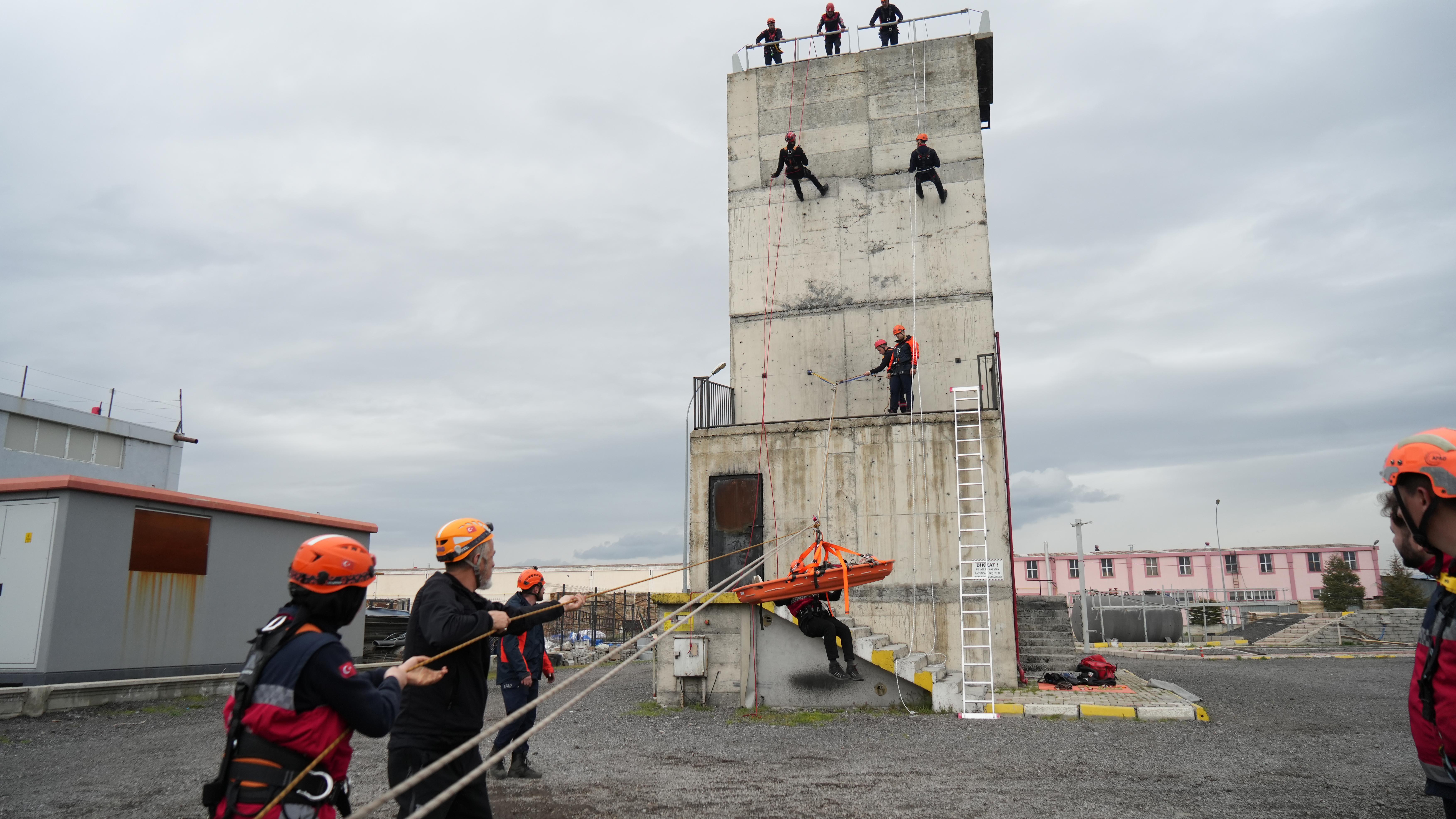 Furkan KAVUKLU/KAYSERİ, (DHA)- AFET ve Acil Durum Yönetimi Başkanlığı (AFAD) Kayseri İl Müdürlüğü ile Organize Sanayi Bölgesi (OSB) İtfaiye Müdürlüğü iş birliğiyle, öğrencilere kayadan düşme ve diğer yaralanmalara müdahale konusunda ‘havai hat’, ‘açılı hat’ ve ‘yüksekten iniş’ eğitimleri verildi.
