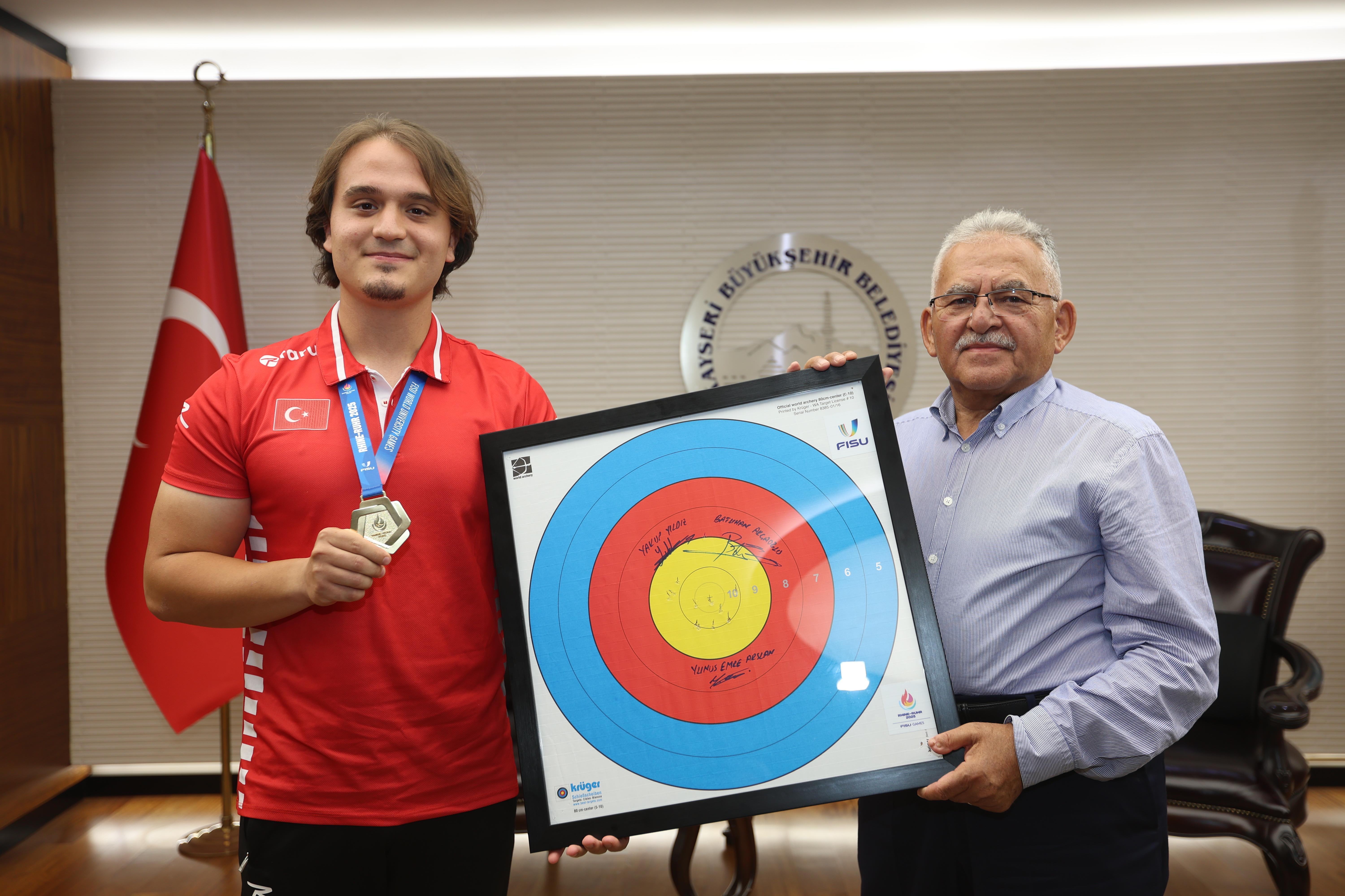 KAYSERİ, (DHA)- KAYSERİ Büyükşehir Belediye Başkanı Memduh Büyükkılıç, 2025 Dünya Üniversite Oyunları’nda takım olarak okçulukta dünya şampiyonluğu kazanan Yunus Emre Arslan’ı makamında kabul etti.