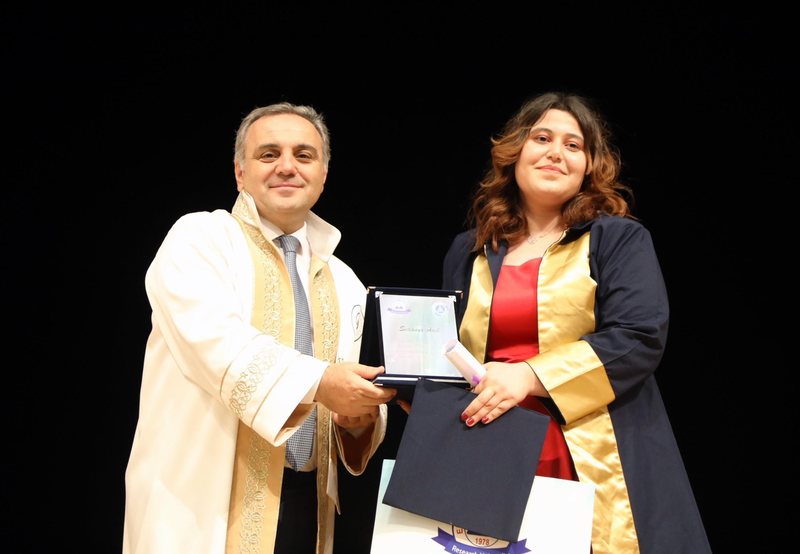 Konuşmalarının ardından dönem birincisi Seda Nur Arık mezuniyet kütüğüne plaket çaktı. Tören, mezun olan 432 öğrenciye diplomalarının verilmesinin ardından sona erdi. (DHA)