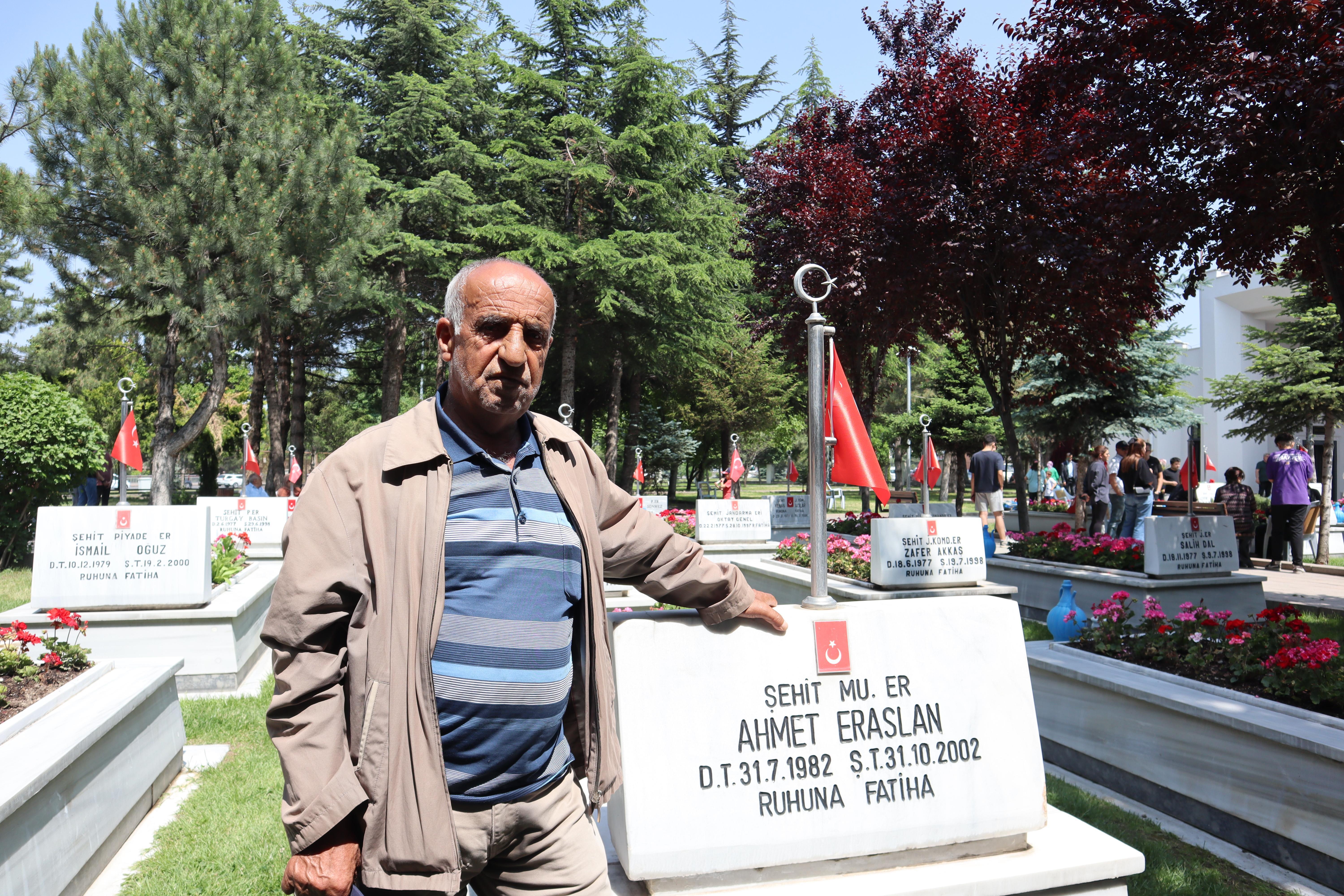 Remzi Batuhan ÜNAL/KAYSERİ, (DHA)- KAYSERİ’de Kurban Bayramı arifesinde şehit aileleri ve vatandaşlar şehitliği ziyaret etti. Şehit Muhabere Er Ahmet Eraslan’ın babası Ali Eraslan, "O bizim elimizi öpmeye gelemiyor, biz onun yüzünü öpmeye geliyoruz. 18 yaşında gitti, bir daha da dönmedi. 6 aylık askerdi" dedi.