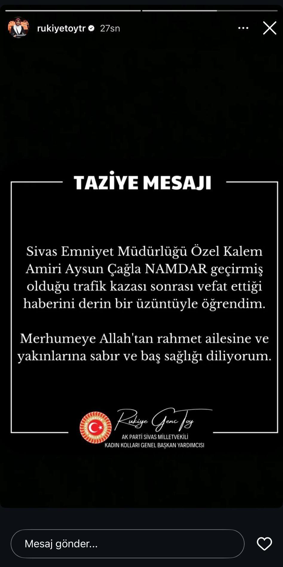 Kayseri'nin Sarız ilçesinde kamyon ile otomobilin çarpıştığı kazada ağır yaralanan ve Kayseri Şehir Hastanesi'nde tedaviye Başkomiser Aysun Çağla Namdar, doktorların tüm müdahalesine rağmen yaşamını yitirdi. Sivas İl Emniyet Müdürü Burhan Akçay'ın özel kalem müdürü olan Başkomiser Namdar'ın vefat haberini AK Parti Sivas Milletvekili Rukiye Toy, sosyal medya hesabından yayınladığı taziye mesajı ile duyurdu. Toy, "Sivas Emniyet Müdürlüğü özel kalem amiri Aysun Çağla Namdar’ın geçirmiş olduğu trafik kazası sonrası vefat ettiği haberini derin bir üzüntüyle öğrendim. Merhumeye Allah'tan rahmet, ailesine ve yakınlarına sabır ve başsağlığı diliyorum" ifadelerine yer verdi.