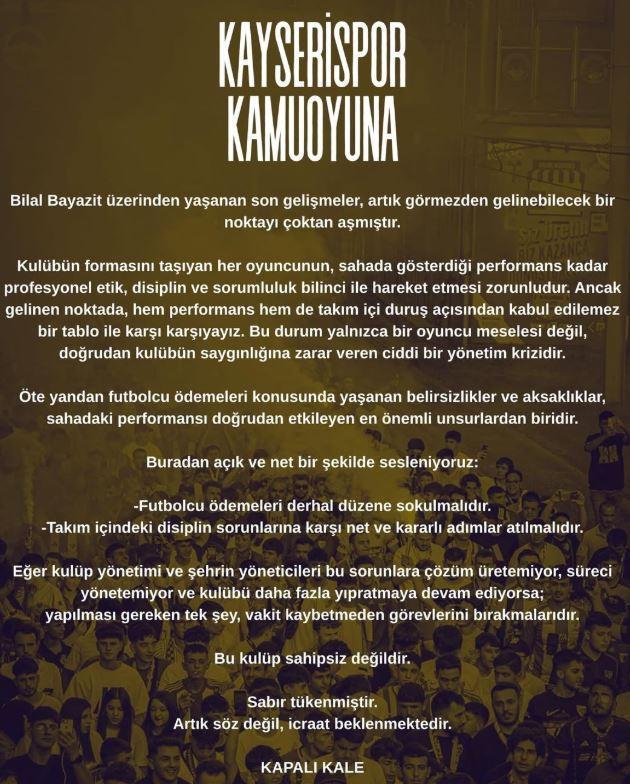 "Büyük Kayserispor Kamuoyuna! Bilal Bayazit üzerinden yaşanan son gelişmeler, artık görmezden gelinebilecek bir noktayı çoktan aşmıştır. Kulübün formasını taşıyan her oyuncunun, sahada gösterdiği performans kadar profesyonel etik, disiplin ve sorumluluk bilinci ile hareket etmesi zorunludur. Ancak gelinen noktada, hem performans hem de takım içi duruş açısından kabul edilemez bir tablo ile karşı karşıyayız. Bu durum yalnızca bir oyuncu meselesi değil, doğrudan kulübün saygınlığına zarar veren ciddi bir yönetim krizidir. Öte yandan futbolcu ödemeleri konusunda yaşanan belirsizlikler ve aksaklıklar, sahadaki performansı doğrudan etkileyen en önemli unsurlardan biridir. Buradan açık ve net bir şekilde sesleniyoruz: Futbolcu ödemeleri derhal düzene sokulmalıdır. Takım içindeki disiplin sorunlarına karşı net ve kararlı adımlar atılmalıdır. Eğer kulüp yönetimi ve şehrin yöneticileri bu sorunlara çözüm üretemiyor, süreci yönetemiyor ve kulübü daha fazla yıpratmaya devam ediyorsa; yapılması gereken tek şey, vakit kaybetmeden görevlerini bırakmalarıdır. Bu kulüp sahipsiz değildir. Sabır tükenmiştir. Artık söz değil, icraat beklenmektedir." (DHA)