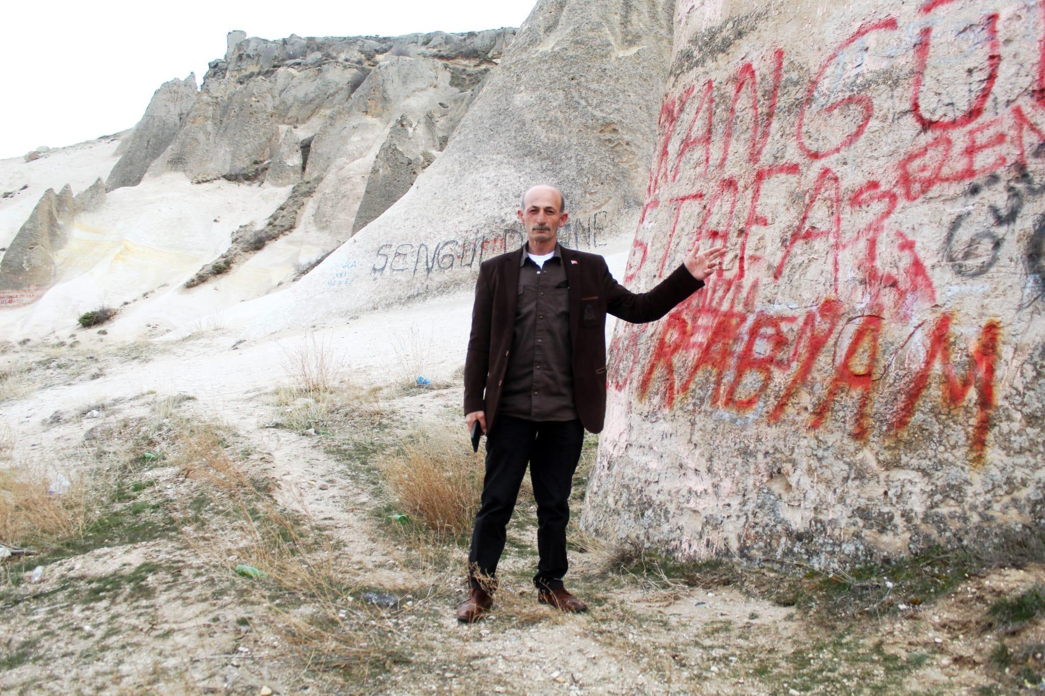 Bölgedeki peribacası benzeri oluşumların daha önce de tahrip edilip kumlama yöntemiyle temizlendiğini de anlatan Sal, “Olmadık yazılar, kötü sözler yazılıyor. Terbiyem müsait değil, söylemek istemiyorum. Daha önce mikro kumlama ile temizlendi, şimdi yine aynı hale geldi. Kaymakamımız, belediye başkanımız bu işin üzerinde duruyor. Gelin, selfienizi çekin ama yazı yazmaya gerek yok. Herkes gelip geçsin, resmini çeksin ama bu tür yazılarla doğayı kirletmeyelim. Sizden ricam budur. Mikro kumlama 2021’de yapılmıştı ama yine aynı hale getirildi. Şimdi tekrar yapılacak. Bundan sonra buranın bu hale gelmemesini halkımızdan rica ediyorum” ifadelerini kullandı.