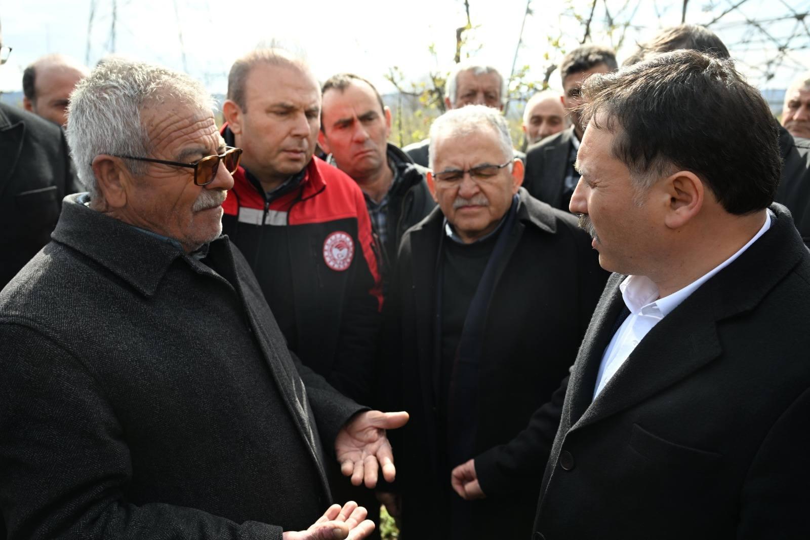 Metin DEĞİRMENCİ/YEŞİLHİSAR, (Kayseri), (DHA)- KAYSERİ Valisi Gökmen Çiçek ve Büyükşehir Belediye Başkanı Memduh Büyükkılıç, 'zirai don' sonrası Yahyalı, Yeşilhisar ve Develi ilçelerindeki çiftçilerle bir araya gelerek, meyve bahçelerinde incelemelerde bulundu.