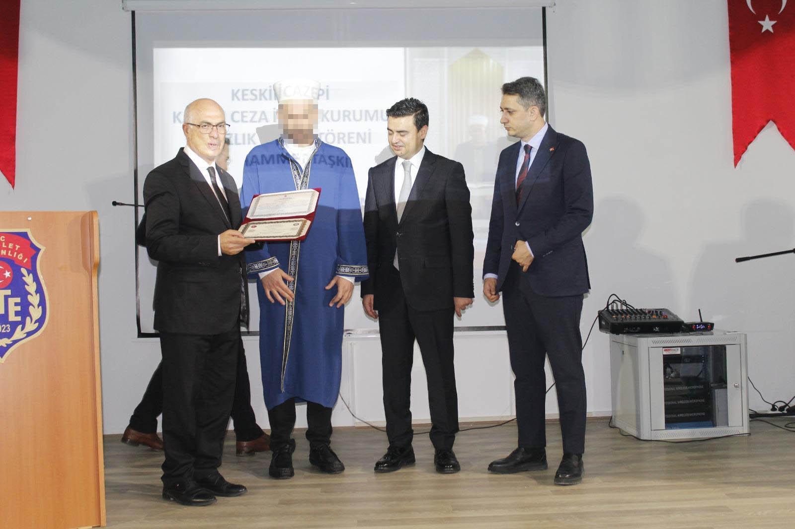 Kırıkkale Cumhuriyet Başsavcısı Akın Çetin, "Ceza infaz kurumlarında sadece cezaların infazı değil aynı zamanda mahkumlarımızın ıslahı da amaçlanmaktadır. Bu hususta Adalet Bakanlığı'mız önemli projeler gerçekleştirilmektedir. İşte tamda bu mimvalde bir hükümlümüzün Kur'an-ı Kerim'i ezberleyerek hafızlık mertebesine ulaşması bu anlayışın en güzel tezahürüdür. Bu hususta mahkumlarımızı Başsavcılık ve Cezaevi idaresi olarak her zaman destekleyeceğimizi bildirmek isterim" dedi. (DHA)
