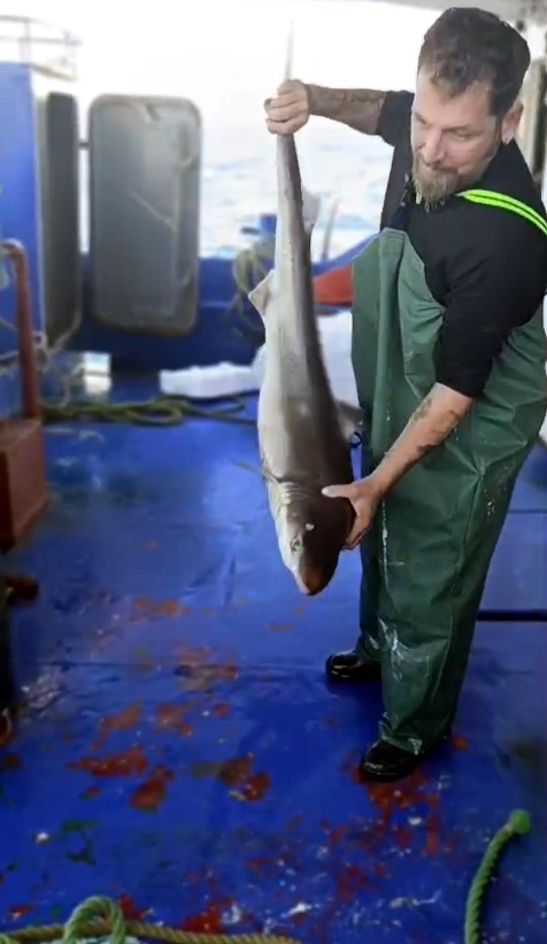 Balıkçı, ağına takılan camgöz köpek balığını yeniden suya bıraktı