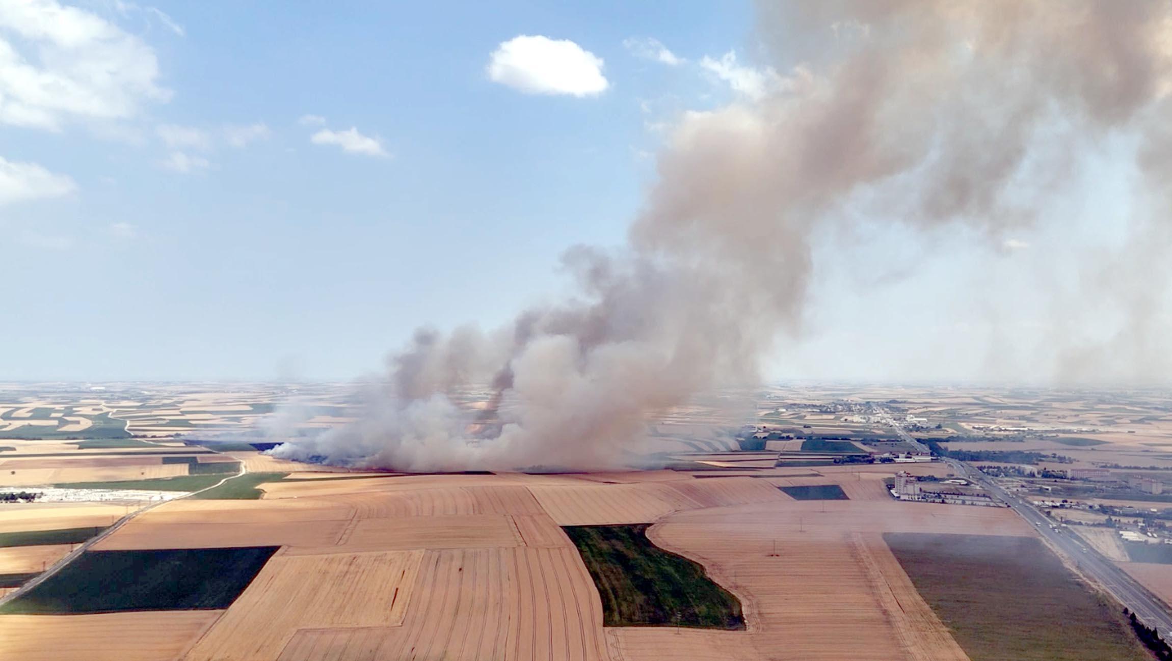 Lüleburgaz ilçesi Yeni Mezarlık mevkisindeki bir buğday tarlasında, henüz belirlenemeyen nedenle saat 15.00 sıralarında yangın çıktı. İhbar üzerine bölgeye Lüleburgaz Belediyesi itfaiye ekipleri sevk edildi. Rüzgarın da etkisiyle alevler kısa sürede büyüdü. İtfaiye ekipleri, alevlere müdahale ediyor. (DHA)