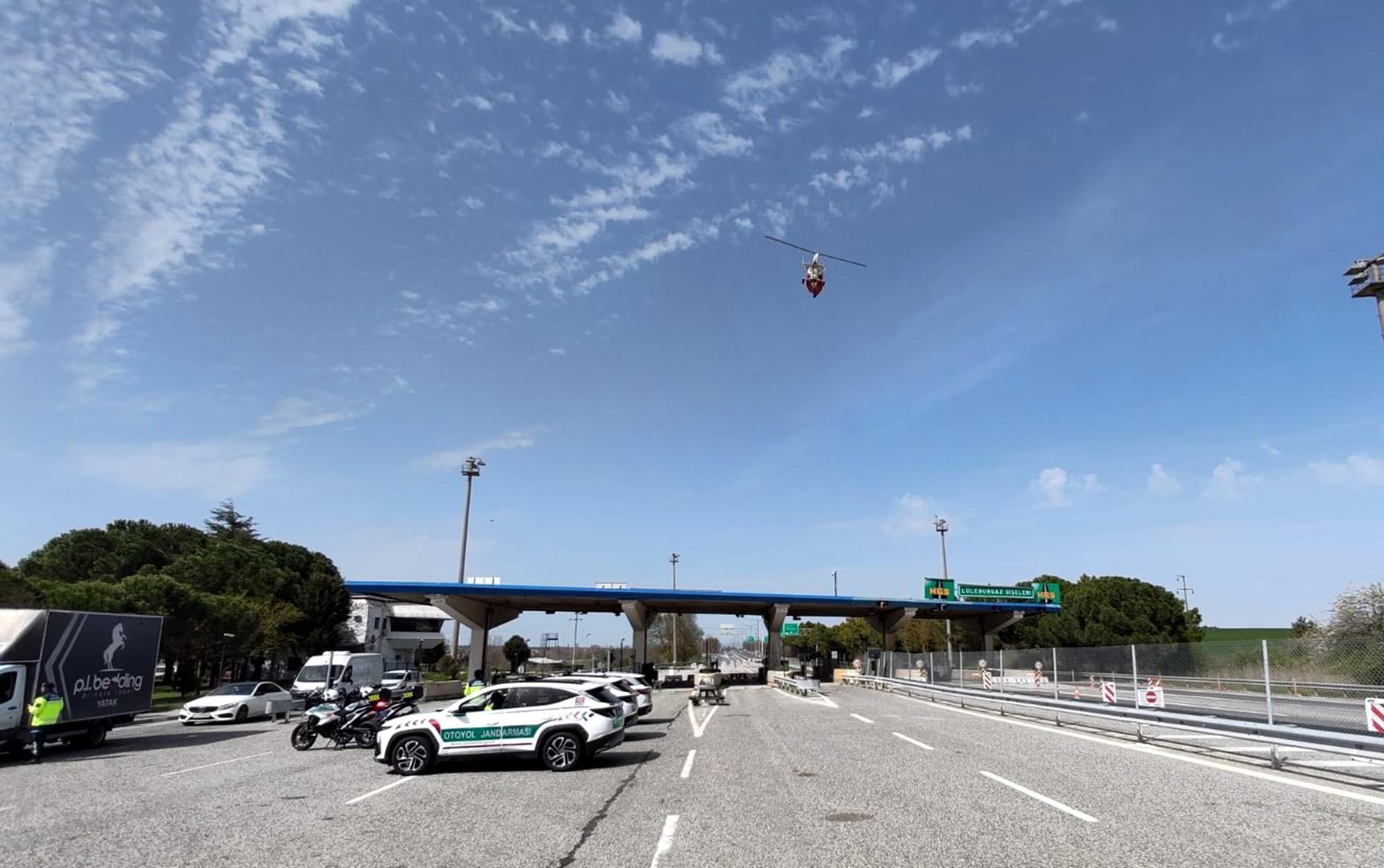 Kırklareli İl Jandarma Komutanlığı Otoyol Jandarma Timleri, trafik kazalarından kaynaklanan can kayıplarını ve yaralanmaları en aza indirmek için Babaeski ve Lüleburgaz ilçelerindeki E-80 otoyolunda Cayrokopter ile havadan trafik denetimi yaptı. Jandarmanın sosyal medya hesabından yapılan paylaşımda, "Vatandaşlarımızın huzur ve güveni için denetimlerimiz devam edecektir. Trafikte yaşanabilecek olumsuzlukları en aza indirmek ve kural ihlali yapan sürücüleri tespit etmek için yapılan uygulamada, sürücülerin emniyet kemeri kullanımı, seyir halindeyken cep telefonuyla konuşmaları, hız limitini aşma başta olmak üzere trafikte risk teşkil edebilecek durumlar havadan kontrol edildi" denildi. (DHA)