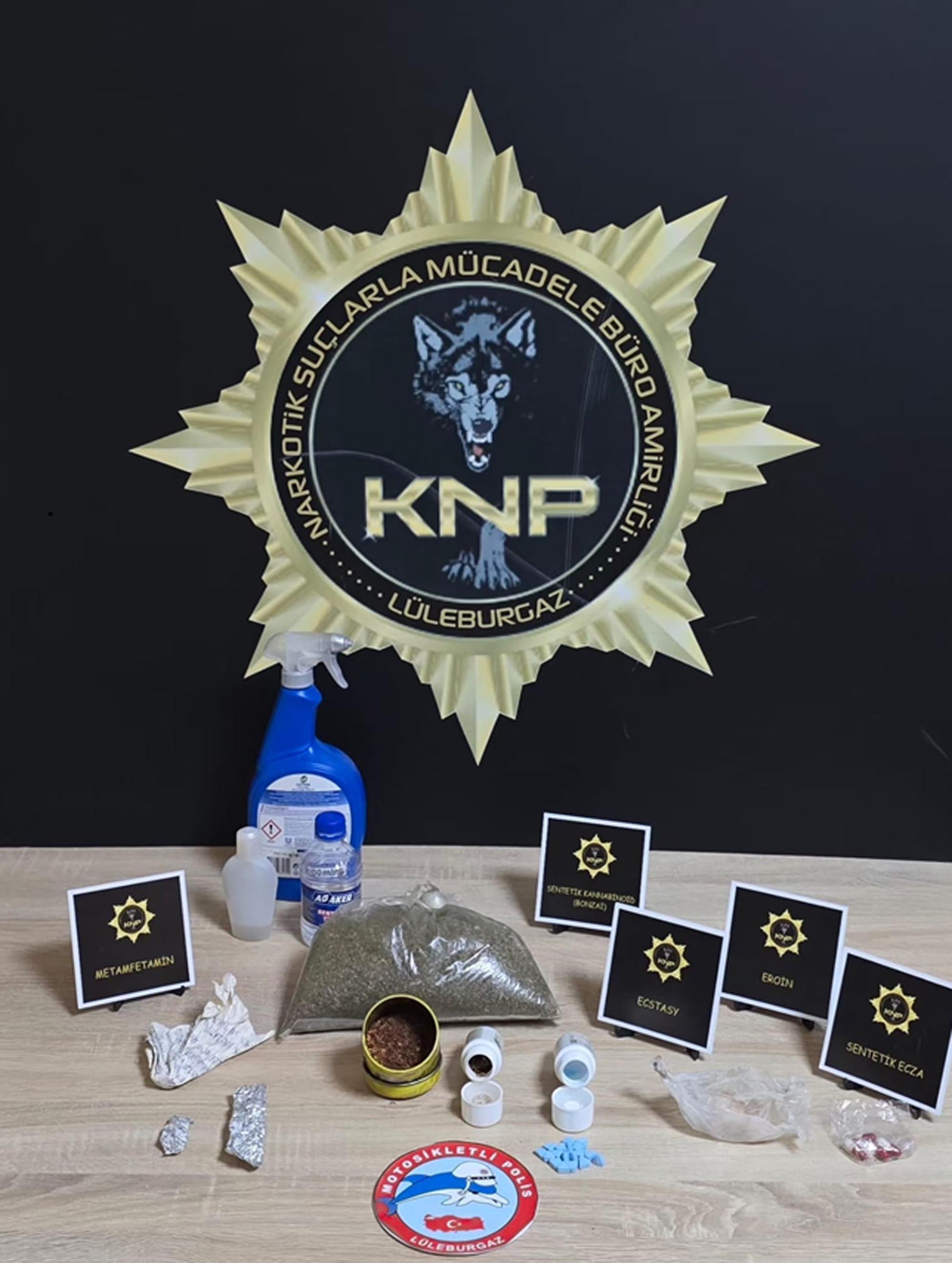 Lüleburgaz İlçe Emniyet Müdürlüğü Narkotik Suçlarla Mücadele Şube Müdürlüğü ile Yunus timleri, uyuşturucu madde bulunduğunu belirlediği evde arama yaptı. Aramada, 343.08 gram bonzai, 22.59 gram eroin, 18.76 gram metamfetamin, 18 uyuşturucu hap, 6 sentetik ecza, uyuşturucu madde üretiminde kullanılan kimyasal maddeler ele geçirildi. Gözaltına 1 şüpheli sevk edildiği adliyede çıkarıldığı mahkemede tutuklandı. (DHA)