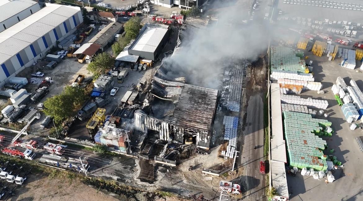 DRONLA GÖRÜNTÜLENDİKocaeli’nin Başiskele ilçesinde lojistik deposunda çıkan ve yaklaşık 3 saatte söndürülen yangın sonrası oluşan hasar dronla görüntülendi. (DHA)FOTOĞRAFLI