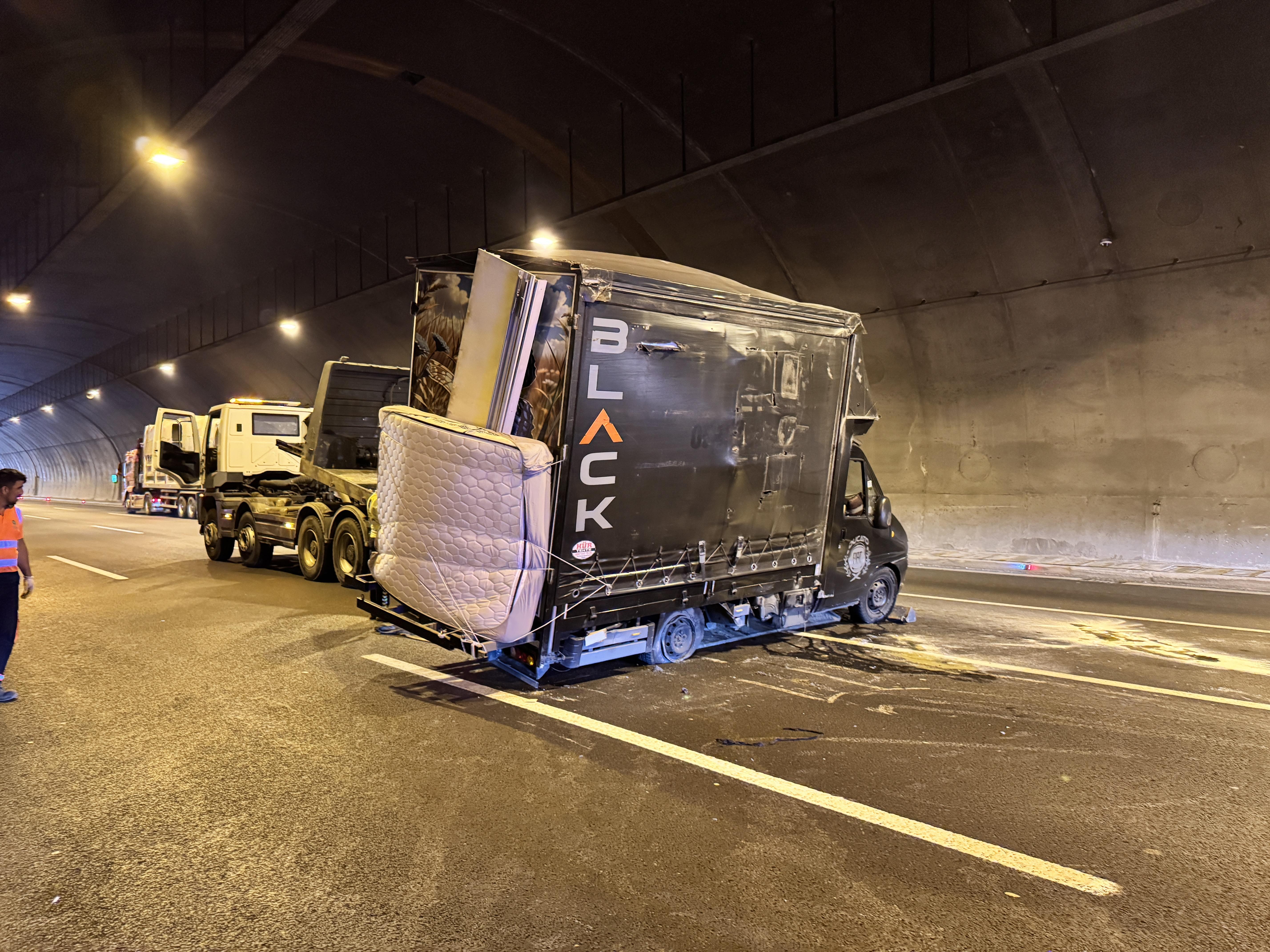 Nazım Özgün ERBULAN/ DERİNCE (Kocaeli), (DHA)- KUZEY Marmara Otoyolu Kocaeli geçişi T-2 Tüneli’nde lastiğinin patlaması sonucu sürücüsünün kontrolünden çıkan ev eşyası yüklü kamyonet, devrildi. Kaza nedeniyle 3 şerit trafiğe kapanırken kamyonetin yoldan kaldırılmasının ardından trafik normale döndü.