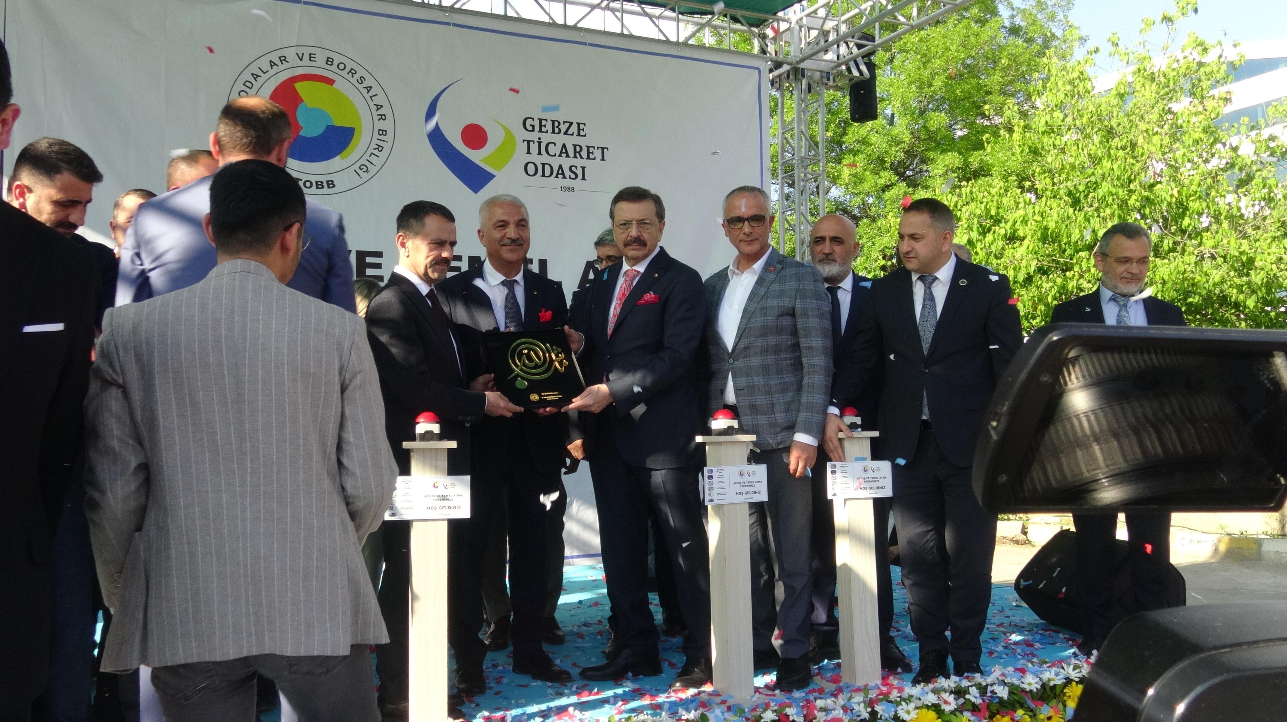 Açılış kurdelesinin kesilmesinin ardından Gebze Ticaret Odası Başkanı Abdurrahman Aslantaş, TOBB Başkanı Hisarcıklıoğlu’na günün anısına hediye taktim etti. (DHA)