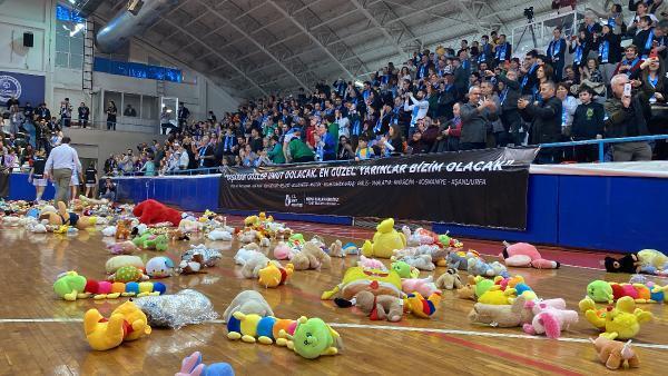Alişan KOYUNCU/İZMİT(Kocaeli),(DHA) - İzmit Belediyespor Kadın Basketbol Takımı ile Kırklareli Basketbol karşılaşmasında taraftarlar maçın devre arasında, deprem bölgesindeki çocuklara gönderilmek üzere sahaya oyuncak attı. Oyuncular seremoniye depremzede çocuklarla çıkarken, başlama atışı öncesinde bazı oyuncuların ağladığı görüldü.