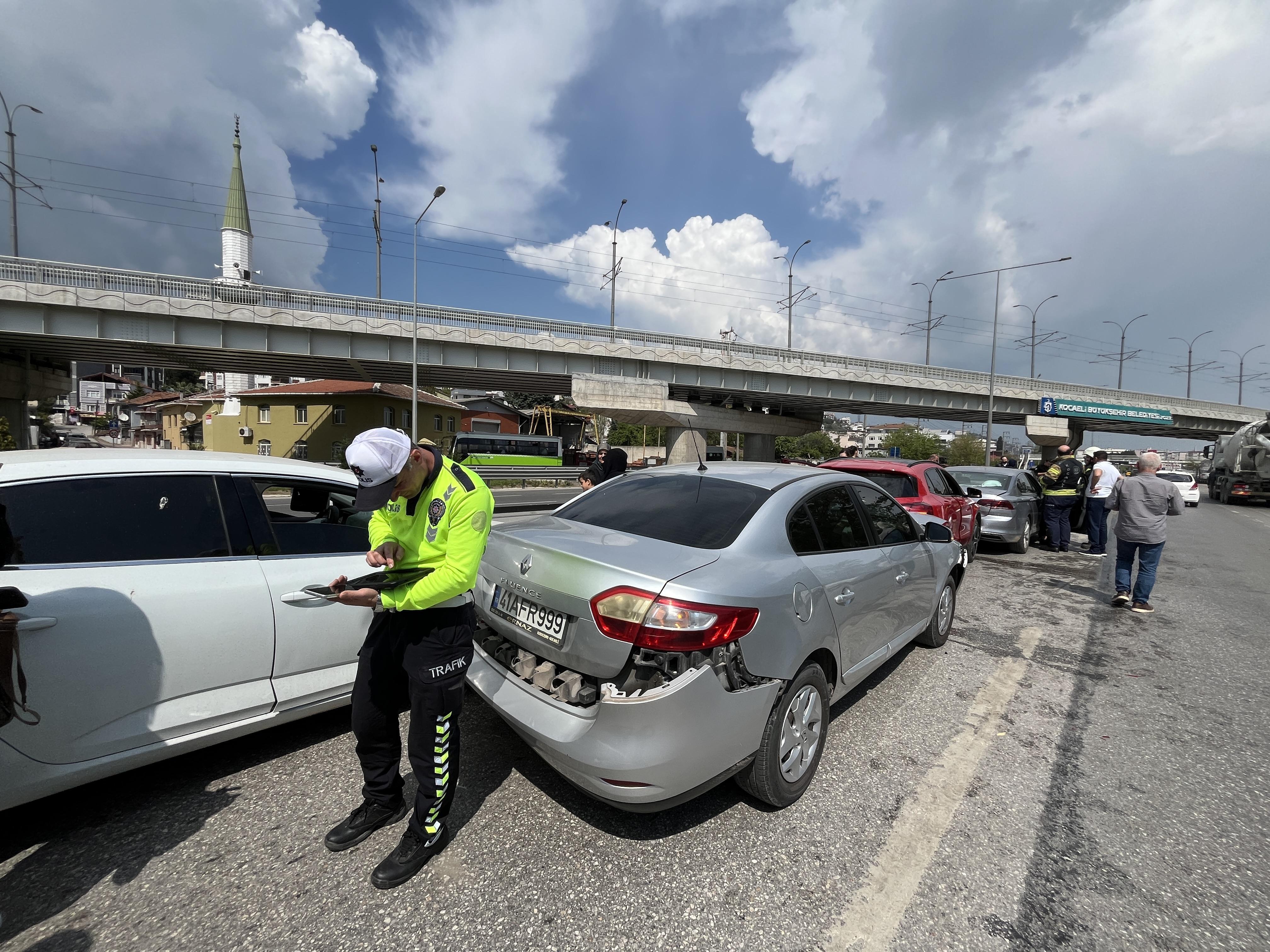 Kaza, saat 14.30 sıralarında D-100 karayolunun İzmit ilçesi geçişi Cumhuriyet Mahallesi mevkisinde meydana geldi. Ankara yönünde giden, sürücülerinin isimleri öğrenilemeyen 41 DE 432, 34 DES 900, 41 FR 999, 41 EN 411 plakalı otomobiller ve 41 GHA 754 plakalı cip, aniden yavaşlayan trafik nedeniyle çarpıştı. Kazada araçlardaki yolculardan G.Ö., F.K. ve H.Ç. yaralandı. Çevredekilerin ihbarı üzerine bölgeye sağlık, itfaiye ve polis ekipleri sevk edildi. Yaralılar, sağlık ekiplerinin ilk müdahalesinin ardından hastaneye kaldırıldı.