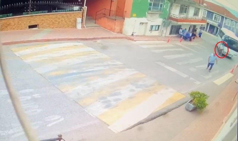 Kaza anı çevredeki güvenlik kamerasına yansıdı. Görüntüde; virajı dönen midibüsün yolun karşısına geçmekte olan M.M.’ye çarptığı ve yayanın aracın altında kaldığı anlar yer alıyor. (DHA)
