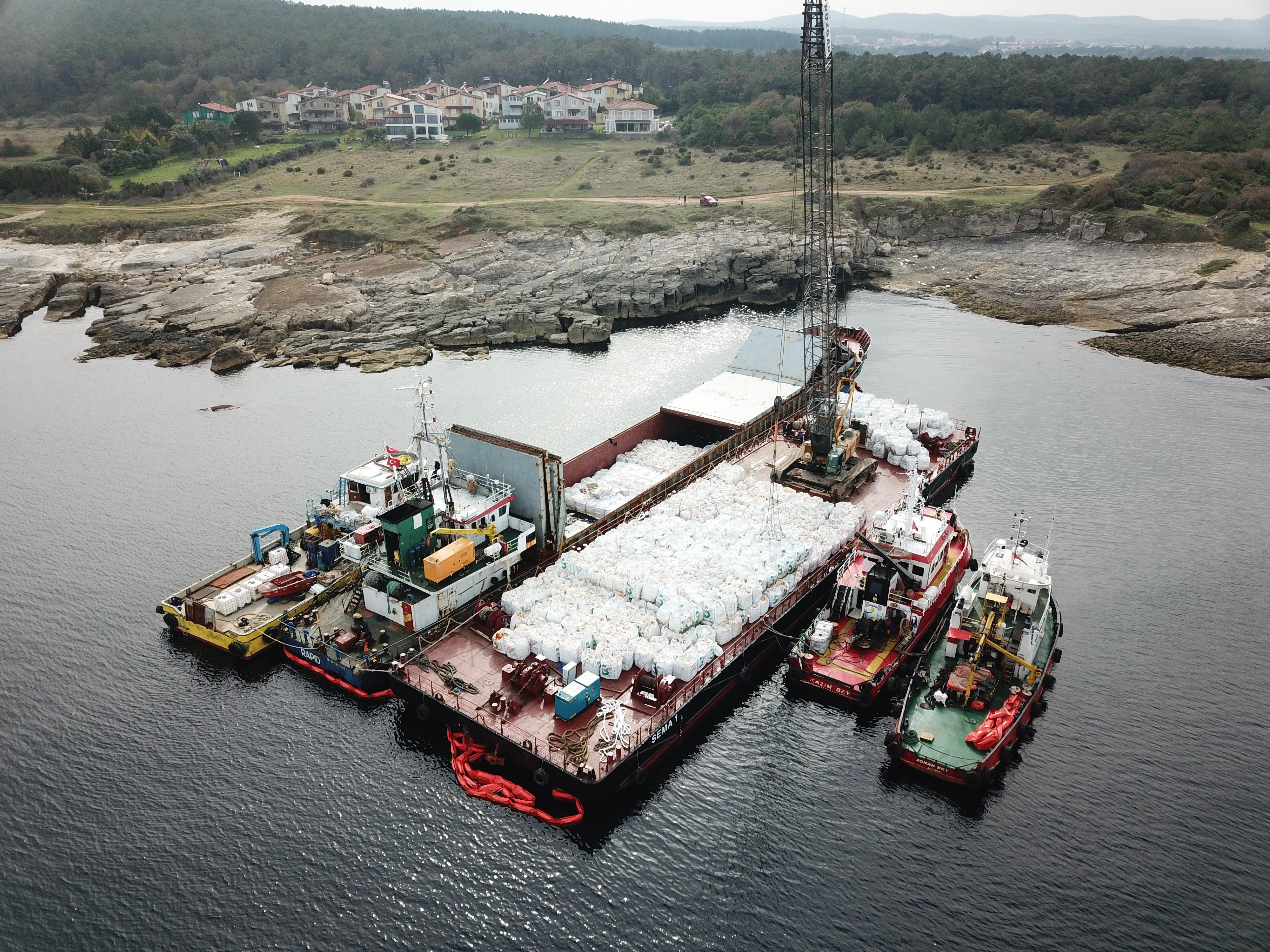 Bugün gemide bulunan 2 bin 135 ton alçının tahliye edilmesi için çalışma başlatıldı. Bu kapsamda bölgeye ‘SEMA 1’ isimli üzerinde vinç bulunan gemi geldi. Vinç ile alçılar gemiye yüklenirken, 2 römorkör ise ‘SEMA 1’ isimli geminin yanında bekliyor. (DHA)