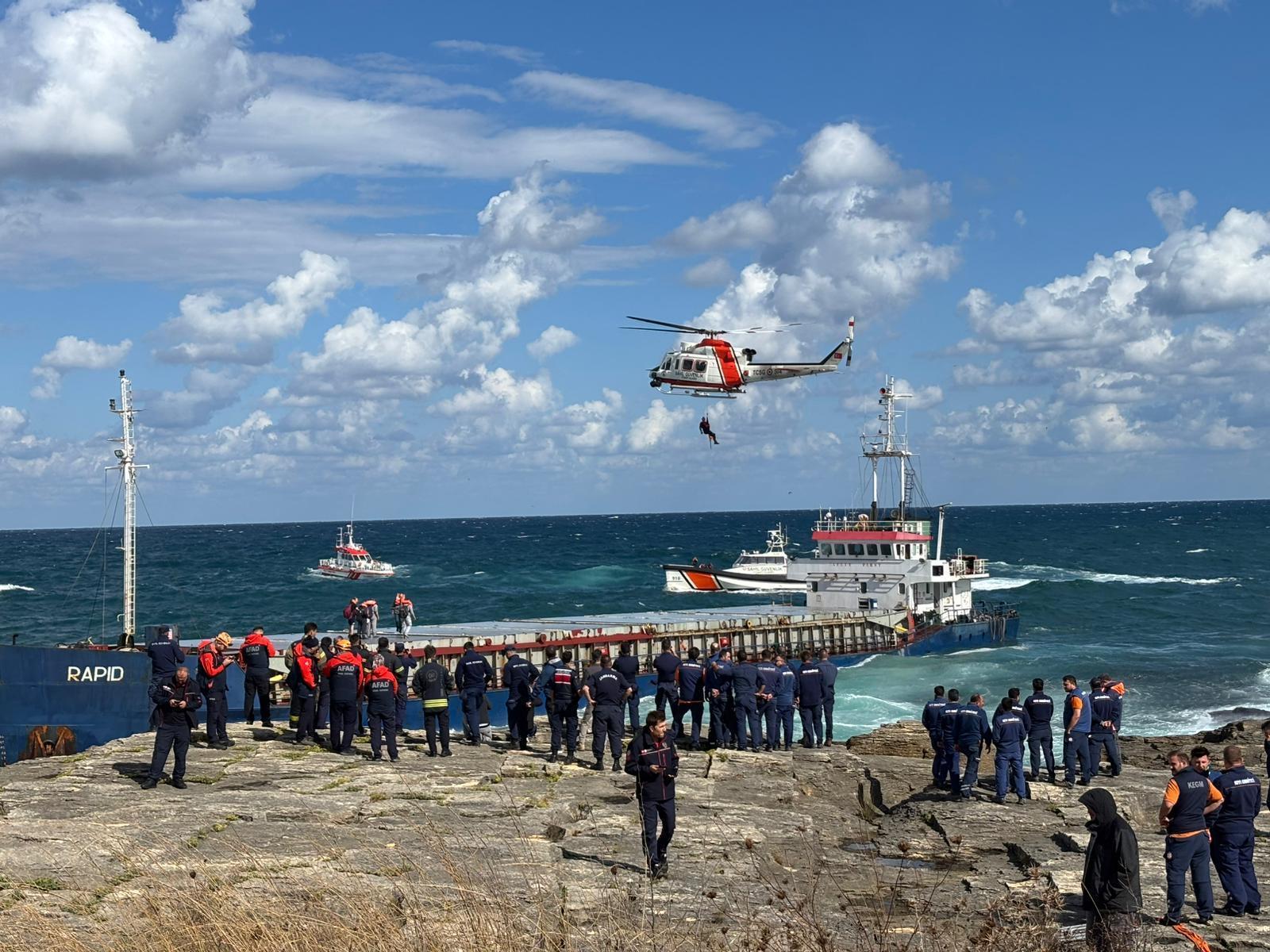 Kocaeli’nin Kandıra ilçesi kıyılarına sürüklenen Tanzanya bandıralı RAPID isimli kuru yük gemisinde mahsur kalan 7 mürettebat, bölgede etkili olan rüzgar ve denizdeki aşırı dalgalar nedeniyle botla müdahale edilemeyince, Sahil Güvenlik Komutanlığı ekipleri tarafından helikopterle kurtarıldı. Helikopterle gemiden alınıp kıyıya çıkarılan mürettebatın sağlık durumlarının iyi olduğu belirtildi.