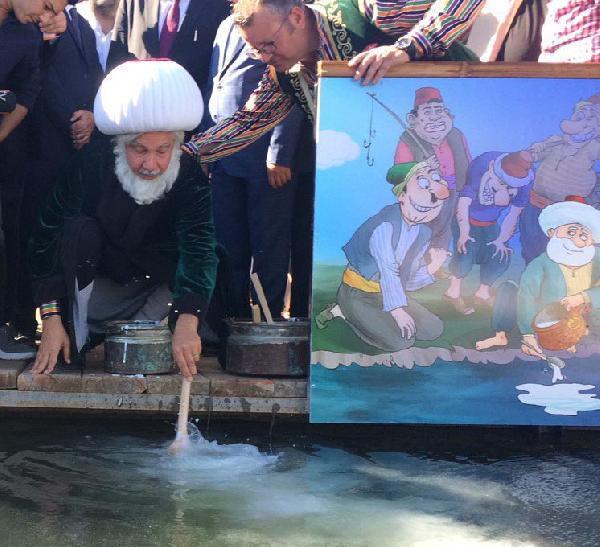 Atilla MEMİŞ/AKŞEHİR (Konya), (DHA)- KONYA'nın Akşehir ilçesinde, Nasreddin Hoca'nın felsefesini dünyaya yaymak için yapılan şenlikte oyuncu Behzat Uygur'un canlandırdığı temsili Nasreddin Hoca, göle yakın bölgedeki gölette maya çaldı.