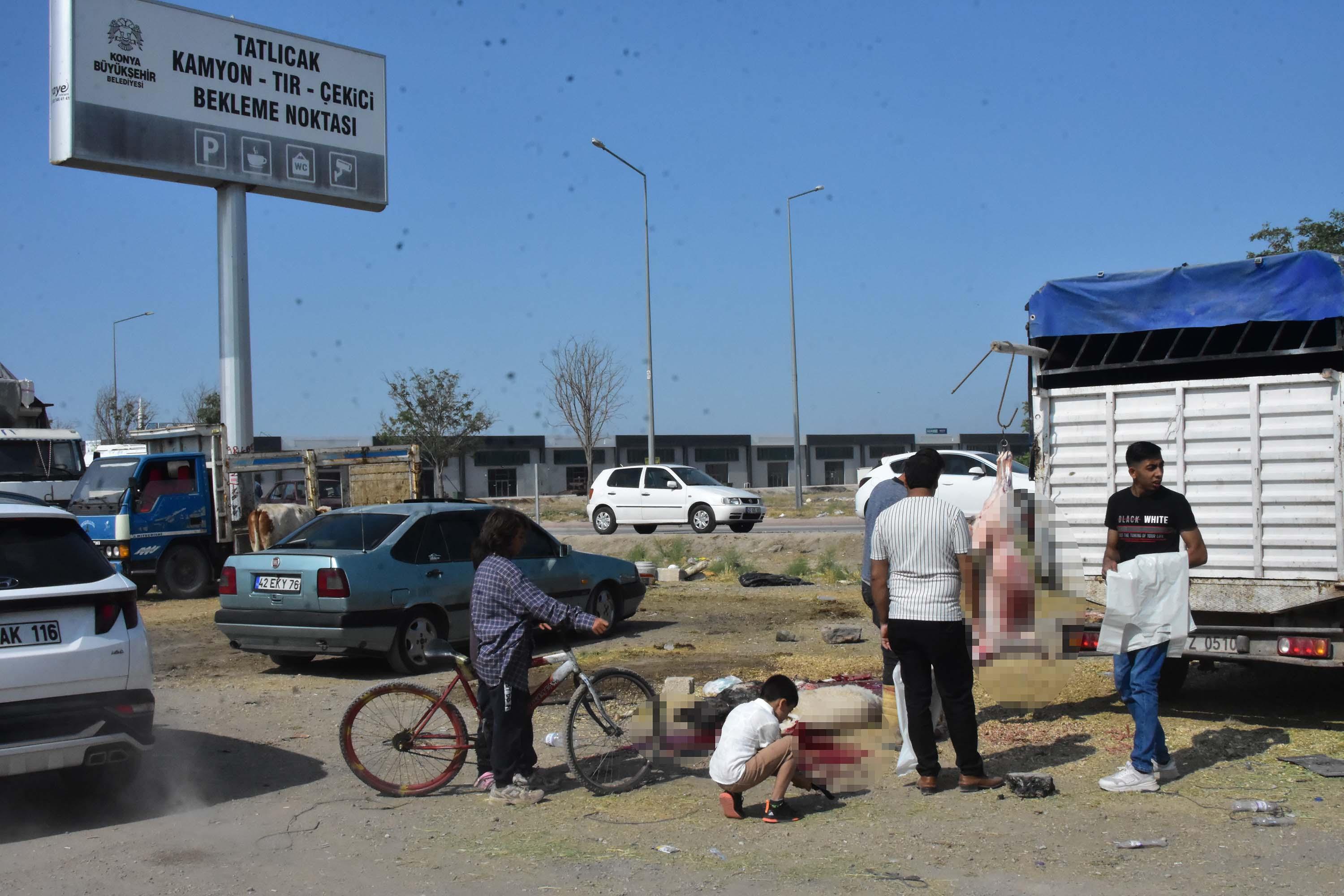 Konya'da Kurban Bayramı öncesi belediyeler hayvan pazarı ile kesim yapılacak yerleri belirleyip, duyurdu. Karatay ilçesi Tatlıcak Mahallesi’nde, besiciler tarafından TIR ve kamyonların bekleme yerine izinsiz olarak hayvan pazarı kurulup, kurbanlık hayvan satışı yapıldı. Kurbanlığını alan kişilerden bazıları da aldıkları yerde hijyen olmayan ortamda hayvanlarını kestirdi. (DHA)