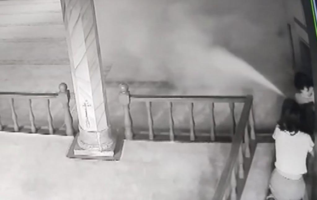 Camide yangın tüpünü birbirinin üzerine sıktılar; o anlar kamerada