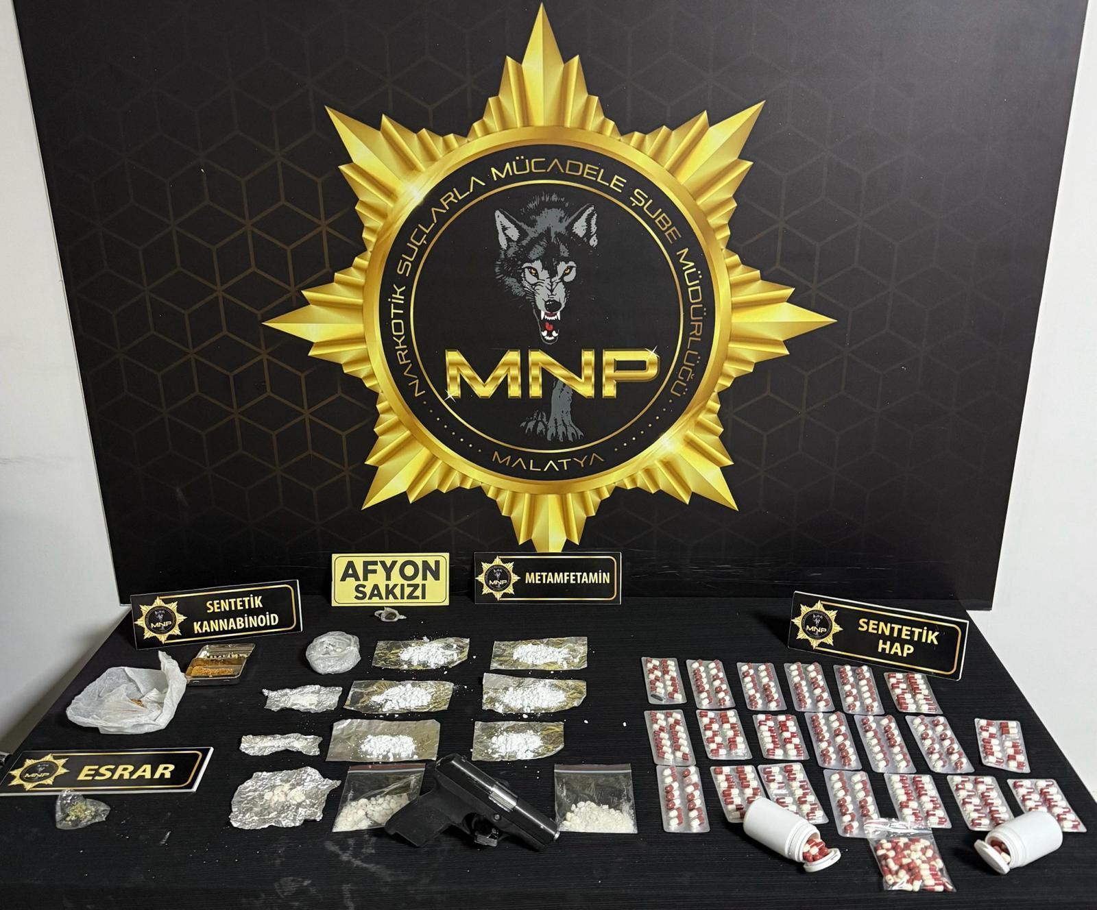 İl Emniyet Müdürlüğü Narkotik Suçlarla Mücadele Şube Müdürlüğü ekipleri tarafından kentte uyuşturucu madde satıcılarına yönelik operasyon düzenlendi. Yapılan fiziki ve teknik takip sonrası tespit edilen 7 şüphelinin adreslerinde arama yapıldı. Aramalarda; 472 sentetik ecza hap, 8 gram sentetik kannabinoid, 60 gram metamfetamin, 3 gram esrar, 2 gram Afyon sakızı ve 1 ruhsatsız tabanca ele geçirildi. Uyuşturucu maddelere ve silaha el koyan ekipler 7 kişiyi gözaltına aldı.