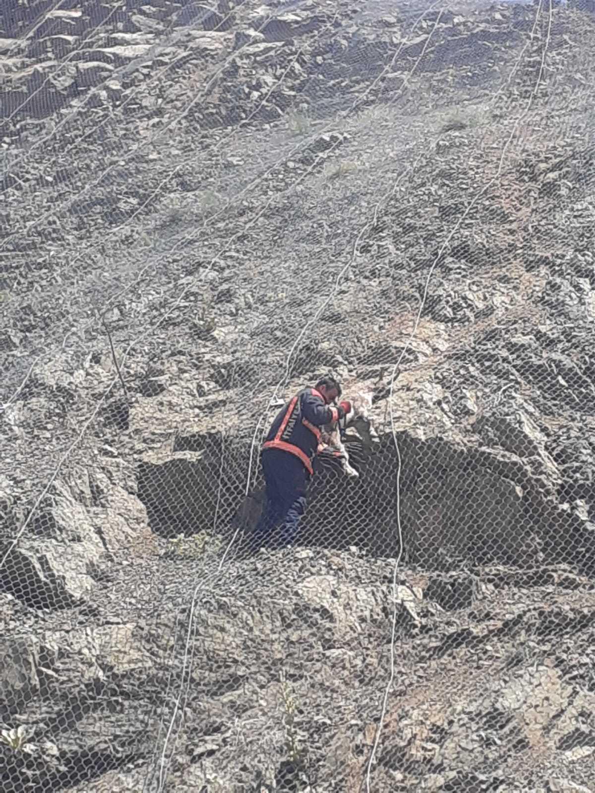 MALATYA, (DHA)- MALATYA'nın Pütürge ilçesinde dağlık alanda koruma ağına takılan 2 yabani keçiyi itfaiyeciler kurtardı.