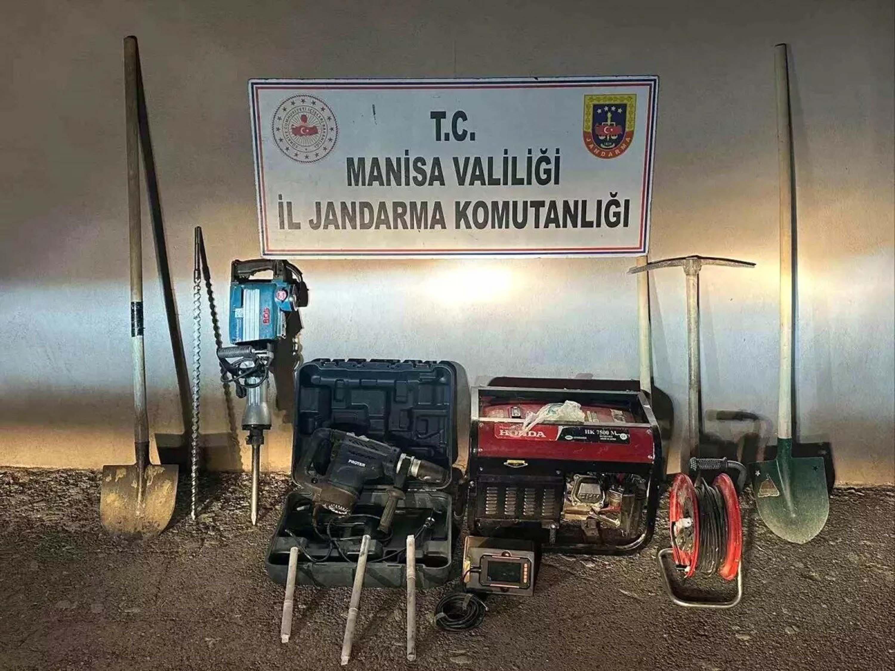 Olay, Akhisar ilçesi Sazoba Mahallesi'nde meydana geldi. Akhisar İlçe Jandarma Komutanlığı ekipleri, ormanda denetim yaparken define aramak için kaçak kazı yapan F.Y. (47), R.T. (40) ve A.İ.G.'yi (62) suçüstü yakaladı. Şüphelilerin kazı sırasında kullandığı kazma, kürek ve el dedektörü ele geçirildi. Gözaltına alınan şüphelilerin işlemlerinin sürdüğü bildirildi.(DHA)