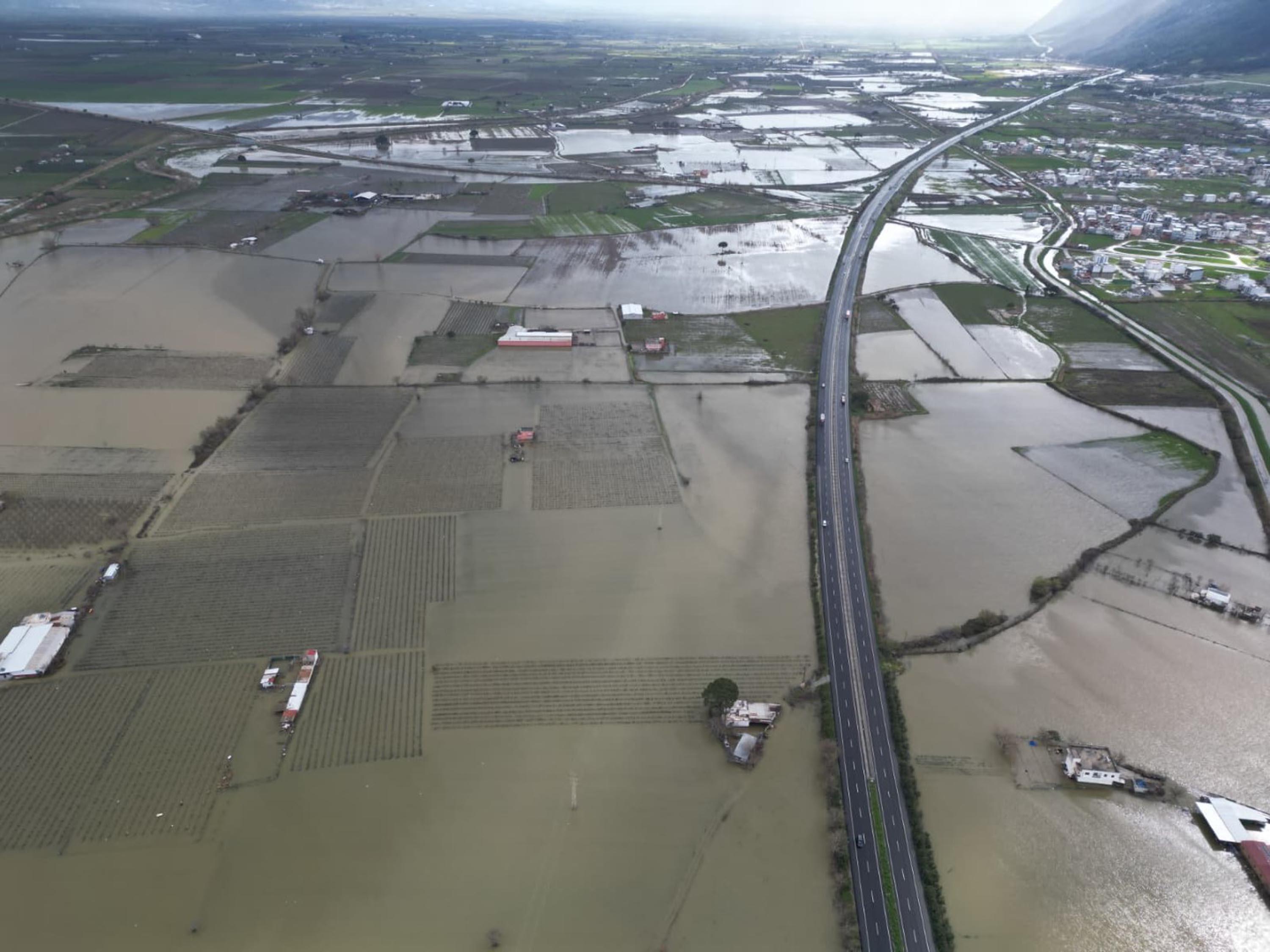 Ersan ERDOĞAN/MANİSA, (DHA)-MANİSA'da son bir haftadır etkili olan sağanak sonrası debisi yükselen Gediz Nehri taştı. Taşkın nedeniyle tarım arazileri, üzüm bağları ve bağ evleri, su altında kaldı. Suyla kaplanan Gediz Ovası, dronla görüntülendi.