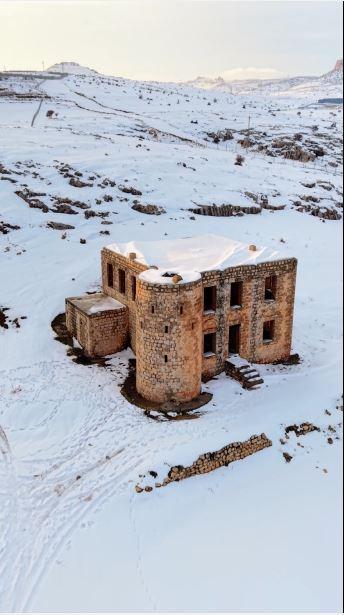 Mardin'de beyaza bürünen tarihi karakol, dronla görüntülendi
