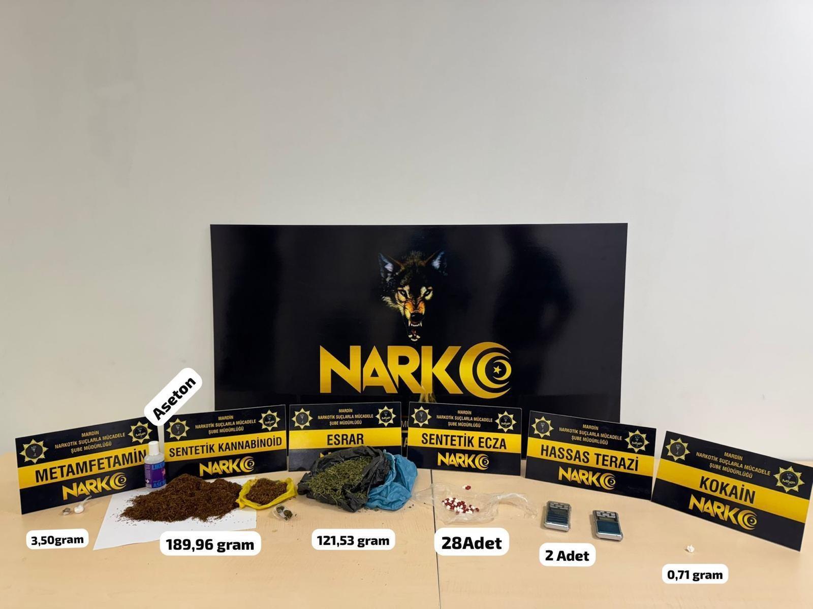 İl Emniyet Müdürlüğü Narkotik Suçlarla Mücadele Şube Müdürlüğü ekipleri, uyuşturucu madde ticareti ve kullanımının önlenmesine yönelik çalışma yürüttü. Bu kapsamda Kızıltepe ilçesinde bir adrese operasyon düzenlendi. Operasyonda bir miktar uyuşturucu, 2 şişe aseton ve 2 hassas terazi ele geçirildi. Operasyonda 2 şüpheli gözaltına alındı. Şüphelilerin emniyetteki işlemleri sürüyor. (DHA)