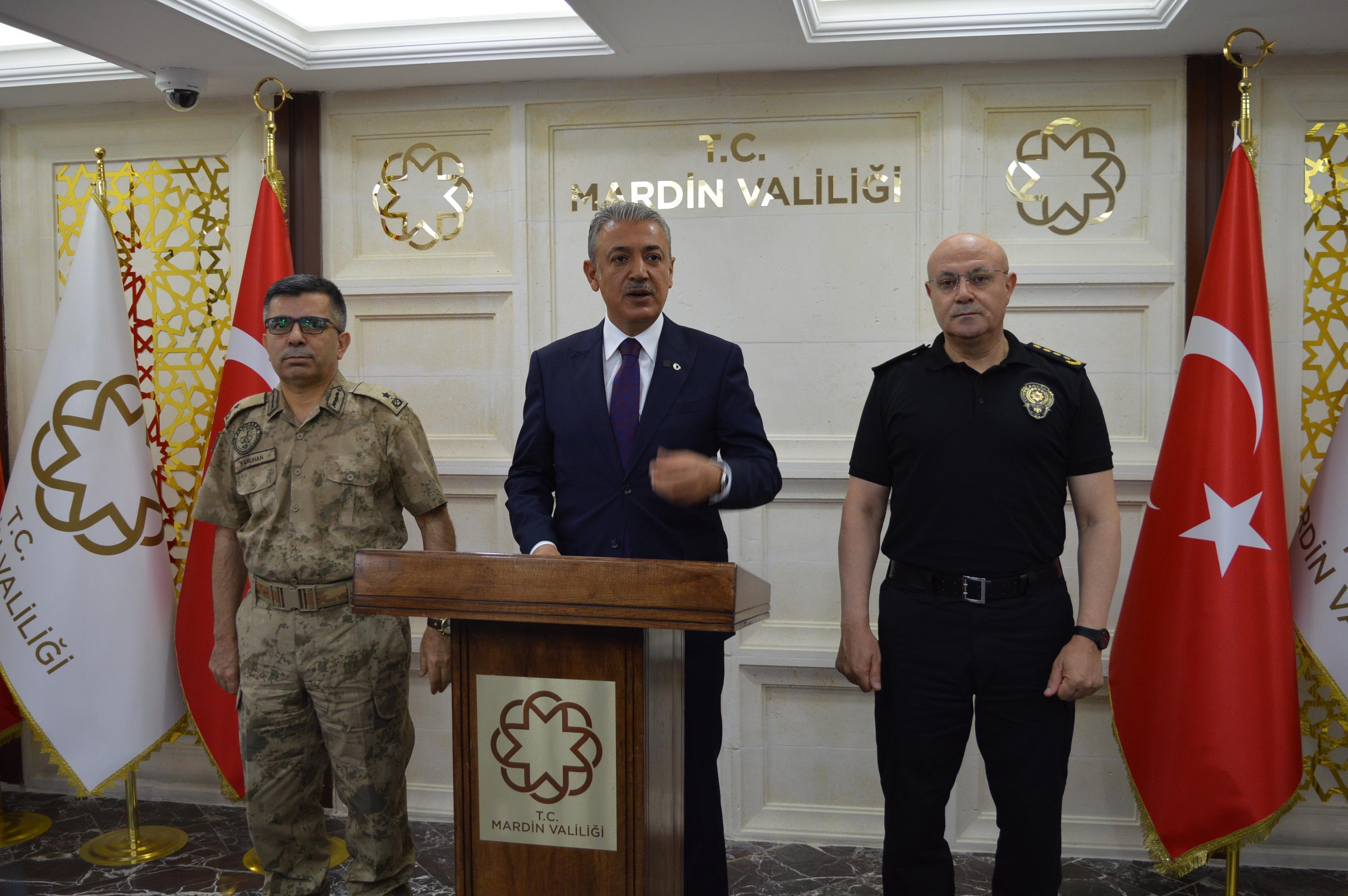 Vali ve Büyükşehir Belediyesi Başkan Vekili Tuncay Akkoyun, İl Jandarma Komutanı Tuğgeneral Tahsin Saruhan ve İl Emniyet Müdürü Cebrail Buğday ile Valilik binasında düzenlenen ‘Asayiş ve Güvenlik Değerlendirme Toplantısı’na katıldı. Toplantı sonrası açıklamalarda bulunan Vali Akkoyun, güvenlik güçlerini özverili çalışmalarından dolayı tebrik etti. Terörle mücadelede kararlılık vurgusu yapan Vali Akkoyun, “Temmuz ayında Mardin’de terör örgütlerine yönelik toplam 3 operasyon düzenlenmiştir. Bu operasyonlar sonucunda gözaltına alınan 5 kişiden 2’si tutuklanmıştır. Terörle Mücadele ile birlikte Organize Suç Çetelerine yönelik operasyonlarımız da kararlılıkla devam etmektedir. Bu kapsamda ilimizde 3 operasyon düzenlenmiş olup 3 kişi hakkında da yasal işlem yapılmıştır. İlimiz genelinde terör, asayiş, organize suçlar ile huzur ve güven uygulamalarında değişik özellik ve çapta 36 silah ile 227 muhtelif mühimmat ele geçirilmiştir” dedi.