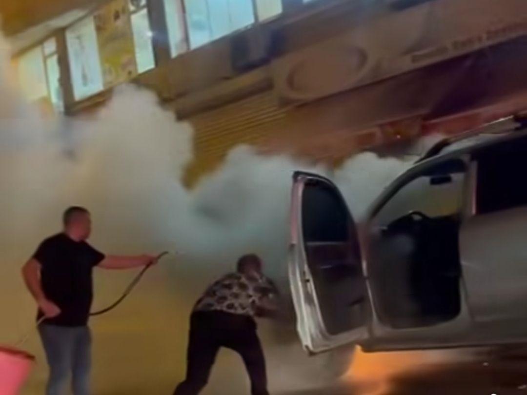 Salih KESKİN/KIZILTEPE (Mardin), (DHA)- MARDİN’in Kızıltepe ilçesinde seyir hakindeyken alev alan hafif ticari araçtaki yangını çevredekiler çeşme hortumuyla söndürmeye çalıştı. O anlar, cep telefonuyla görüntülendi.