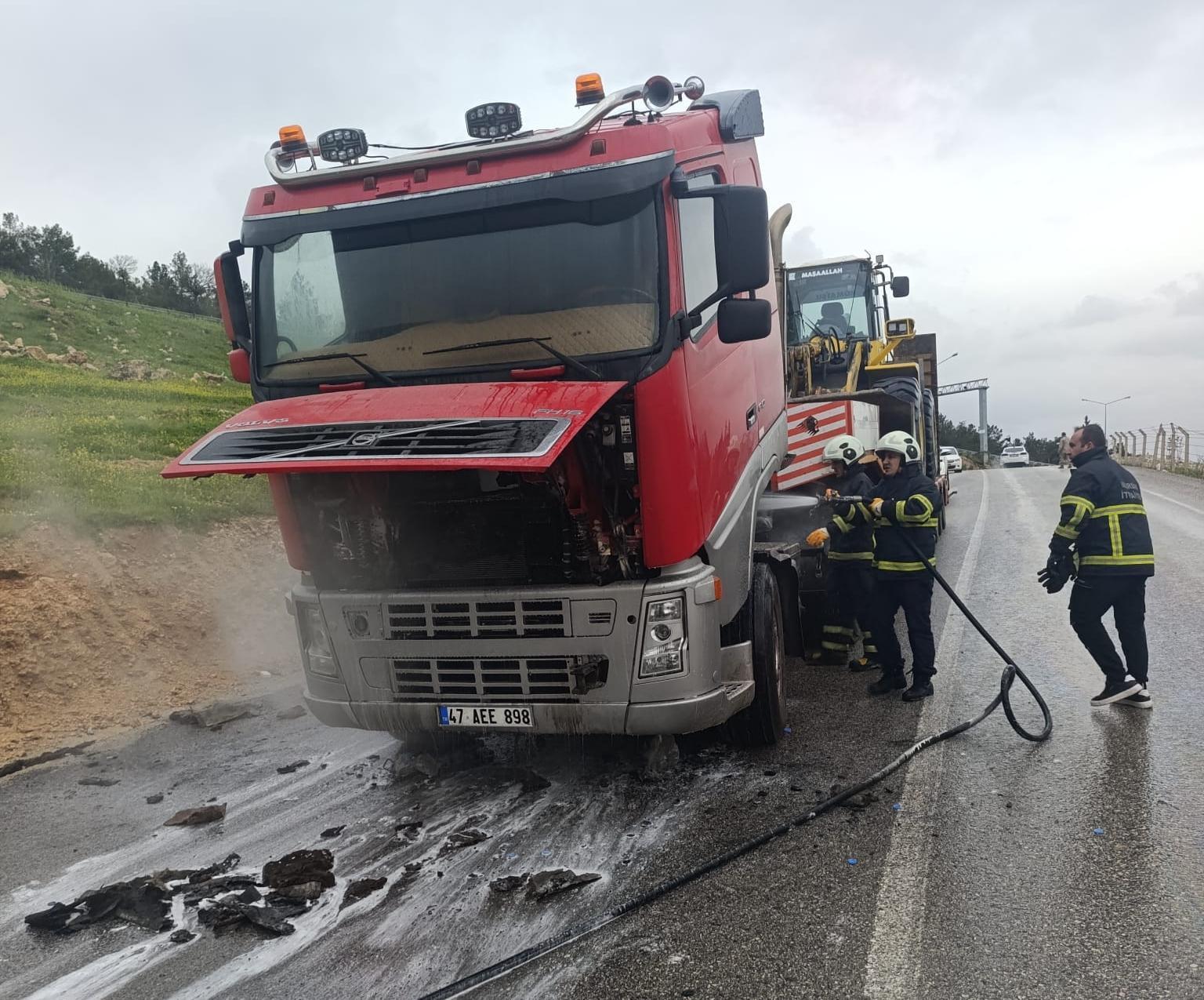Mardin'de iş makinesi yüklü çekicide çıkan yangın söndürüldü