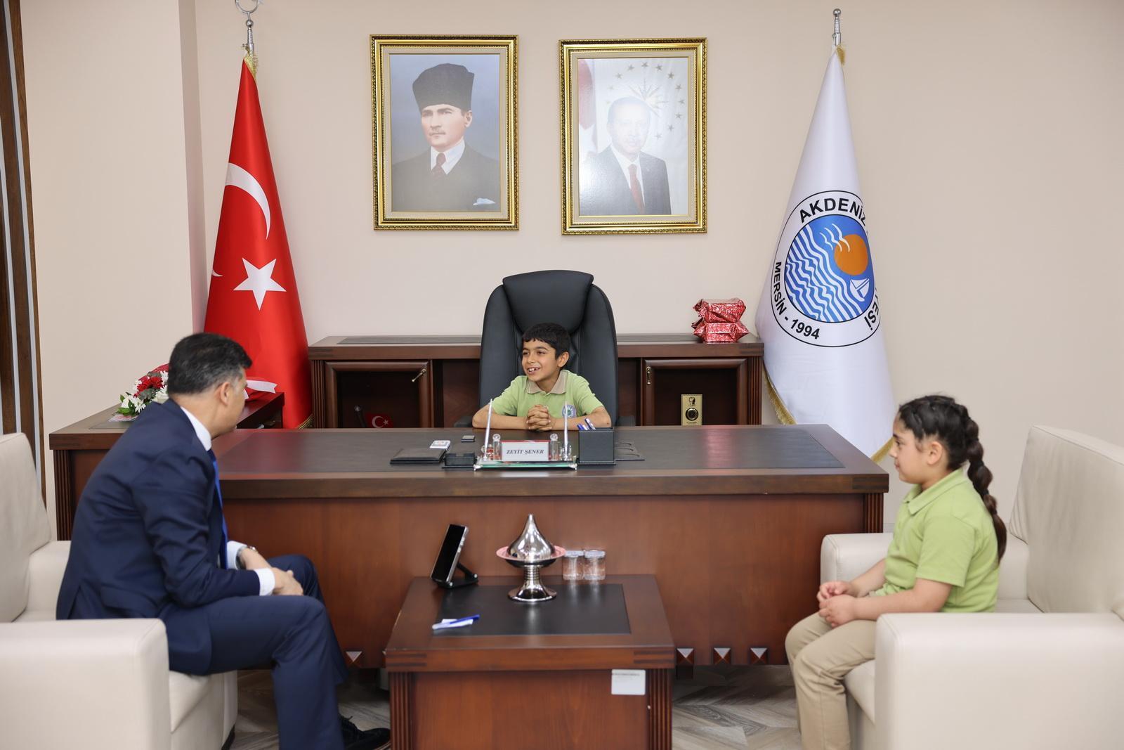 MERSİN, (DHA)-MERSİN’de 23 Nisan İlkokulu öğrencilerinden Beyzanur Fırat ve Kadir Avcı, 23 Nisan Ulusal Egemenlik ve Çocuk Bayramı kutlamaları kapsamında Akdeniz Kaymakamı ve Belediye Başkan Vekili Zeyit Şener’i ziyaret etti. Ziyarette, Akdeniz Kaymakamı ve Belediye Başkan Vekili Zeyit Şener, başkanlık koltuğunu ilkokul 3'üncü sınıf öğrencisi Kadir Avcı'ya emanet etti.