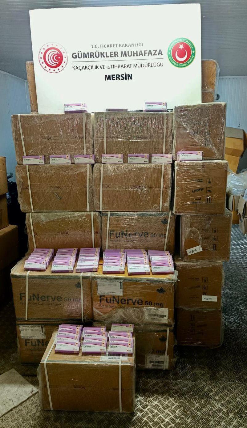 Gümrük Muhafaza, Kaçakçılık ve İstihbarat Müdürlüğü'ne bağlı ekipler tarafından suç ve suçlularla mücadele kapsamında yürütülen takipli çalışmalar kapsamında yurtdışından Mersin Limanı'na gelerek buradan yine yurtdışına gidecek olan ve geçici depolama alanında bulunan 50 koli içerisinde 280 bin adet pregabalin etken maddeli sentetik ecza ürünü ele geçirildi. Olayla ilgili Mersin Cumhuriyet Başsavcılığınca soruşturma başlatıldı. (DHA)