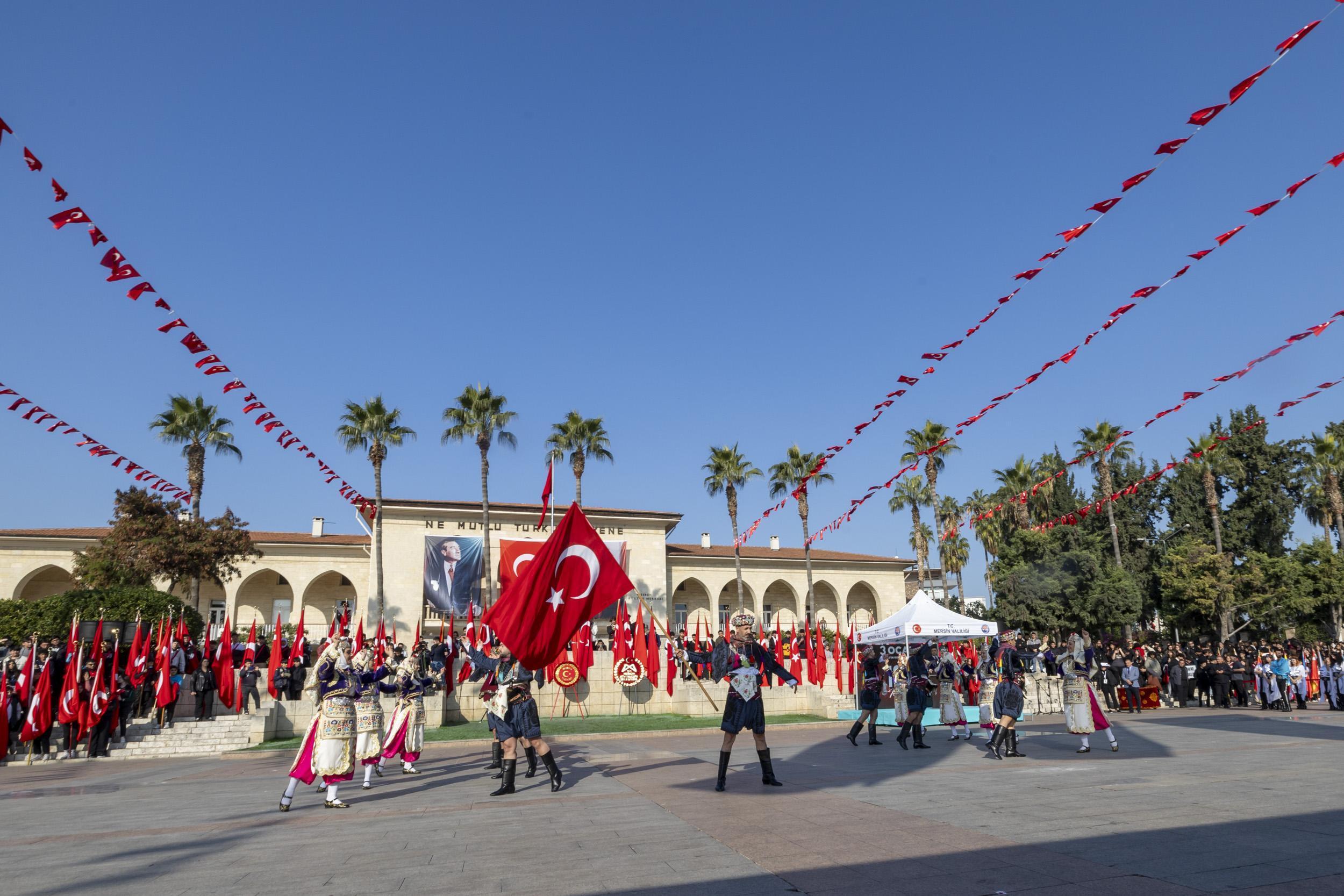 Cumhuriyet Meydanı'nda Vali Pehlivan, Tuğamiral Eser ve Başkan Seçer'in, Atatürk Anıtı'na çelenk sunumuyla başlayan tören, saygı duruşu ve İstiklal Marşı'nın okunmasıyla sürdü. Vali Pehlivan, Tuğamiral Eser ve Başkan Seçer, cipe binerek kutlamalara katılanları tebrik etti. Törende öğrenciler şiirler okudu, Büyükşehir Belediyesi halk oyunları ekibi gösteri yaptı. Etkinlikler, Jandarma Genel Komutanlığı komando birliğinin tüfekli hareketi ile Özel Asayiş Komutanlığı personeli tarafından helikopterle gerçekleştirilen 'Üzüm salkımı' gösterisi ile son buldu. (DHA)